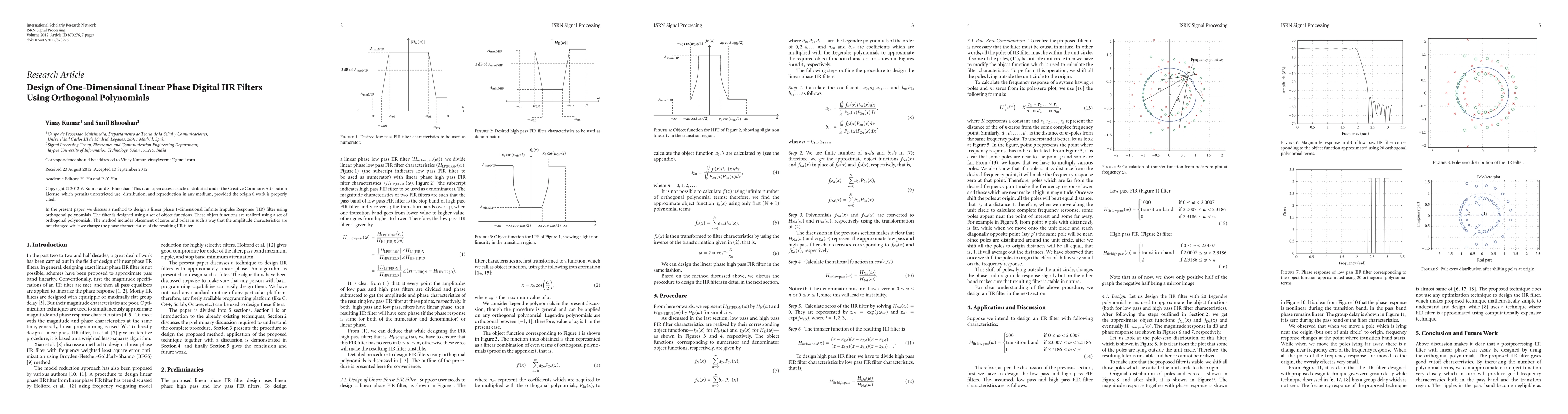 This paper presents a method for designing linear phase 1-D IIR filters using orthogonal polynomials, ensuring that amplitude characteristics remain unchanged while altering phase characteristics through strategic zero and pole placement.