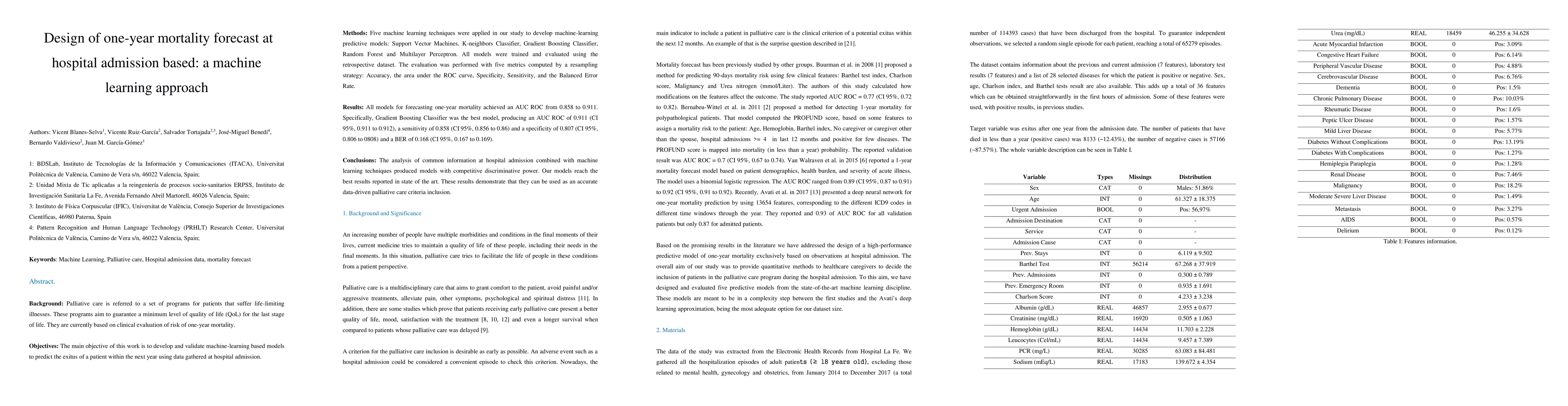 Background: Palliative care is referred to a set of programs for patients that suffer life-limiting illnesses. These programs aim to guarantee a minimum level of quality of life (QoL) for the last stage of life. They are currently based on clinical evaluation of risk of one-year mortality. Objectives: The main objective of this work is to develop and validate machine-learning based models to predict the exitus of a patient within the next year using data gathered at hospital admission. Methods: Five machine learning techniques were applied in our study to develop machine-learning predictive models: Support Vector Machines, K-neighbors Classifier, Gradient Boosting Classifier, Random Forest and Multilayer Perceptron. All models were trained and evaluated using the retrospective dataset. The evaluation was performed with five metrics computed by a resampling strategy: Accuracy, the area under the ROC curve, Specificity, Sensitivity, and the Balanced Error Rate. Results: All models for forecasting one-year mortality achieved an AUC ROC from 0.858 to 0.911. Specifically, Gradient Boosting Classifier was the best model, producing an AUC ROC of 0.911 (CI 95%, 0.911 to 0.912), a sensitivity of 0.858 (CI 95%, 0.856 to 0.86) and a specificity of 0.807 (CI 95%, 0.806 to 0808) and a BER of 0.168 (CI 95%, 0.167 to 0.169). Conclusions: The analysis of common information at hospital admission combined with machine learning techniques produced models with competitive discriminative power. Our models reach the best results reported in state of the art. These results demonstrate that they can be used as an accurate data-driven palliative care criteria inclusion.