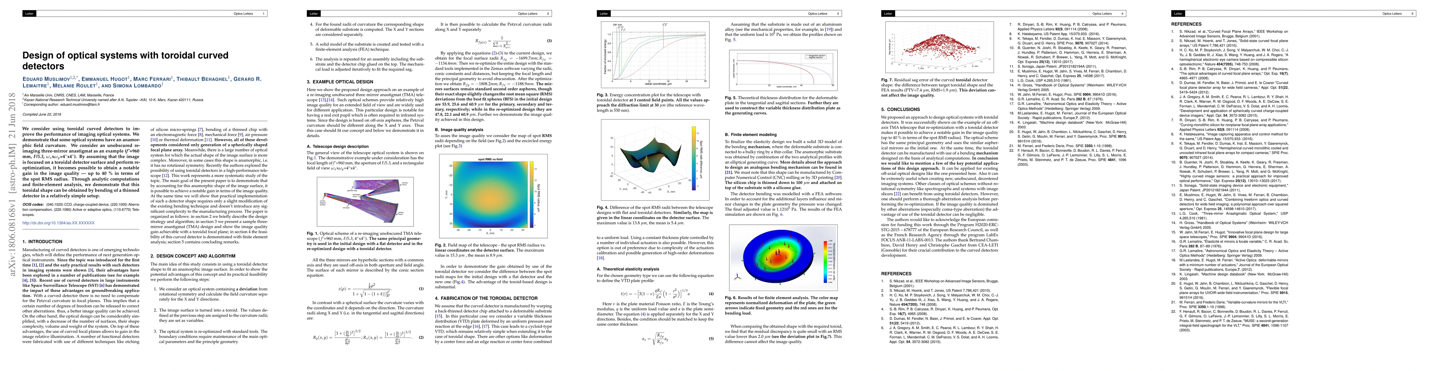 This paper explores the use of toroidal curved detectors to enhance the performance of optical imaging systems, specifically demonstrating significant improvements in image quality for a three-mirror anastigmat system. By optimizing the system with a toroidal detector, the authors achieve up to a 40% reduction in the spot RMS radius, facilitated by a simple bending setup.