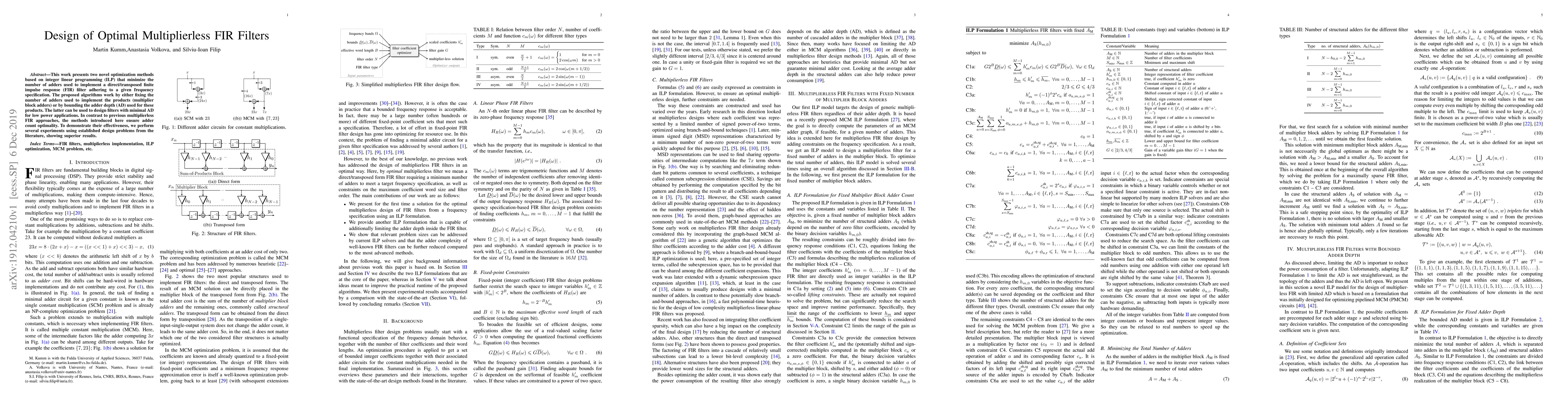This paper introduces two novel integer linear programming methods to optimize multiplierless FIR filters by minimizing adder usage, ensuring optimality in adder count. Experiments show superior performance compared to previous methods, particularly for low power applications.