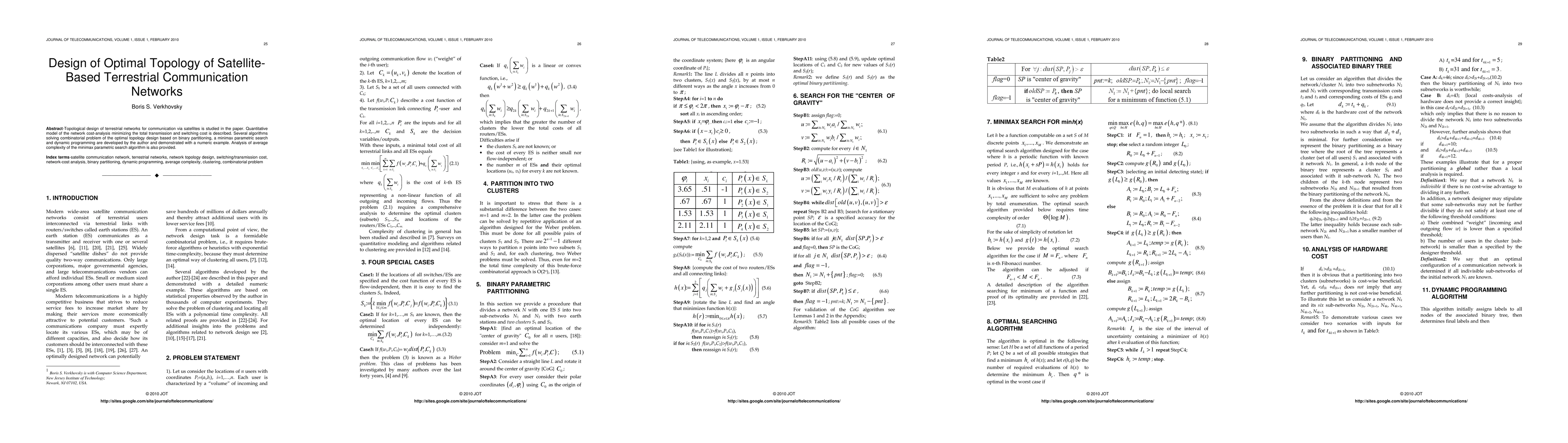 Topological design of terrestrial networks for communication via satellites is studied in the paper. Quantitative model of the network cost-analysis minimizing the total transmission and switching cost is described. Several algorithms solving combinatorial problem of the optimal topology design based on binary partitioning, a minimax parametric search and dynamic programming are developed by the author and demonstrated with a numeric example. Analysis of average complexity of the minimax parametric search algorithm is also provided.