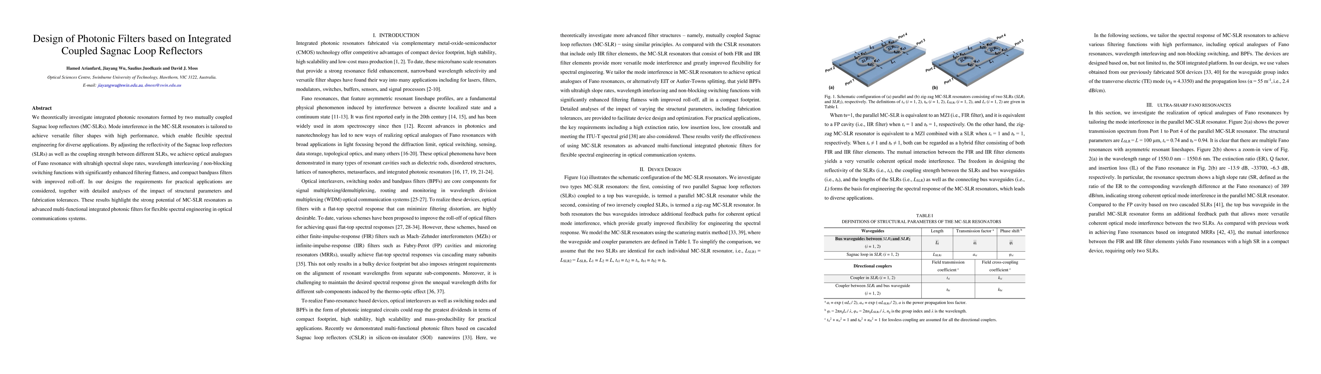 This paper explores integrated photonic resonators based on coupled Sagnac loop reflectors, achieving versatile filter shapes through tailored mode interference. The design enables advanced spectral engineering with high performance, including Fano resonance analogues, wavelength interleaving, and compact bandpass filters, while considering practical application requirements and fabrication tolerances.