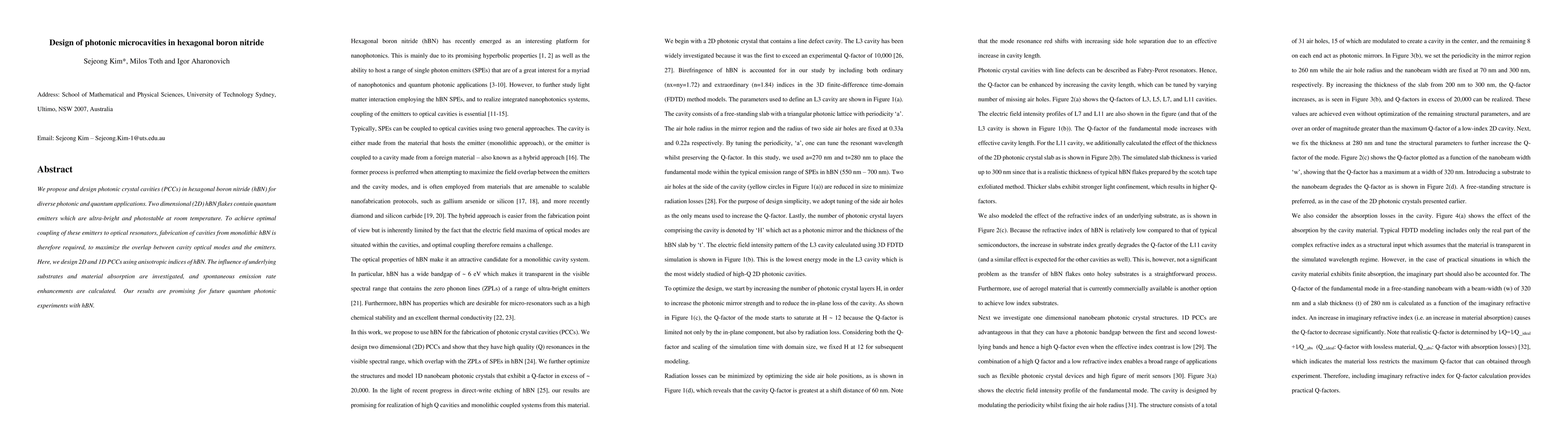This paper proposes the design of photonic crystal cavities (PCCs) in hexagonal boron nitride (hBN) to optimize the coupling of ultra-bright, photostable quantum emitters to optical resonators, demonstrating potential for quantum photonic applications and evaluating the impact of substrate and absorption.