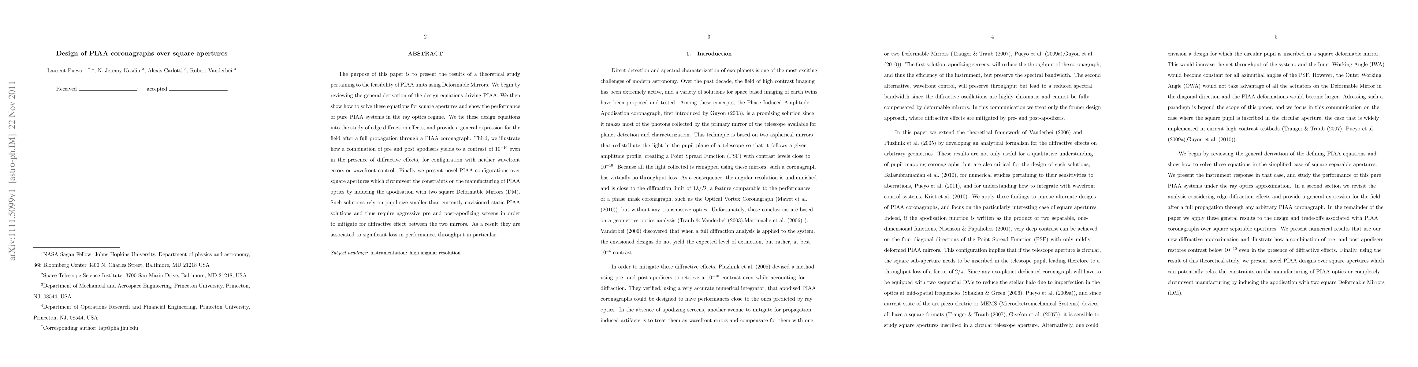 This paper explores the design of PIAA coronagraphs using deformable mirrors over square apertures, demonstrating how to solve PIAA equations for square apertures and achieving a contrast of 10^10 without wavefront errors. It also introduces novel configurations using two deformable mirrors to mitigate manufacturing constraints, though at the cost of performance and throughput.