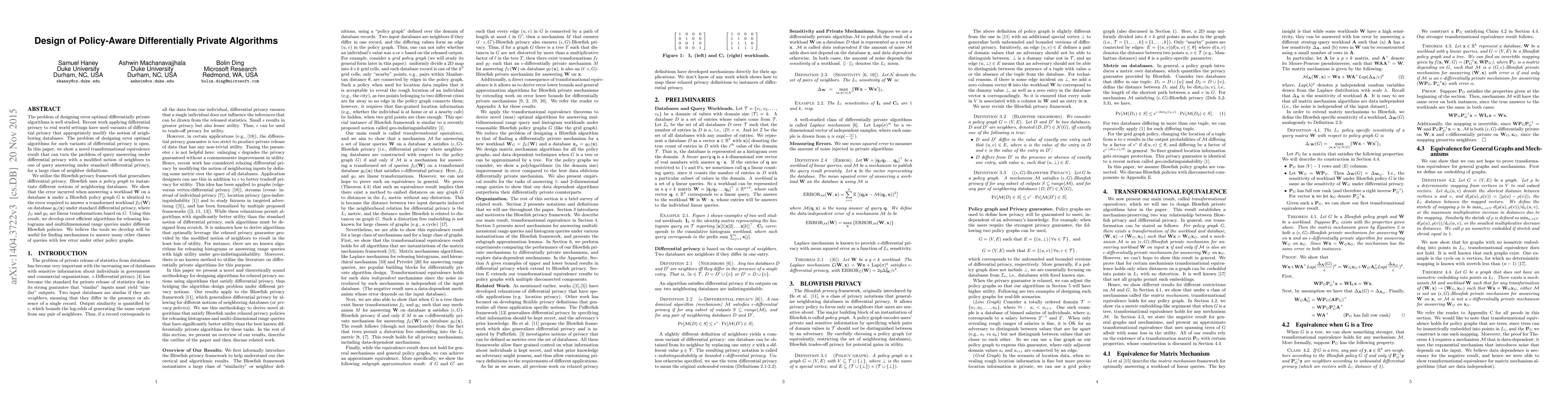 The problem of designing error optimal differentially private algorithms is well studied. Recent work applying differential privacy to real world settings have used variants of differential privacy that appropriately modify the notion of neighboring databases. The problem of designing error optimal algorithms for such variants of differential privacy is open. In this paper, we show a novel transformational equivalence result that can turn the problem of query answering under differential privacy with a modified notion of neighbors to one of query answering under standard differential privacy, for a large class of neighbor definitions. We utilize the Blowfish privacy framework that generalizes differential privacy. Blowfish uses a {\em policy graph} to instantiate different notions of neighboring databases. We show that the error incurred when answering a workload $\mathbf{W}$ on a database $\mathbf{x}$ under a Blowfish policy graph $G$ is identical to the error required to answer a transformed workload $f_G(\mathbf{W})$ on database $g_G(\mathbf{x})$ under standard differential privacy, where $f_G$ and $g_G$ are linear transformations based on $G$. Using this result, we develop error efficient algorithms for releasing histograms and multidimensional range queries under different Blowfish policies. We believe the tools we develop will be useful for finding mechanisms to answer many other classes of queries with low error under other policy graphs.
