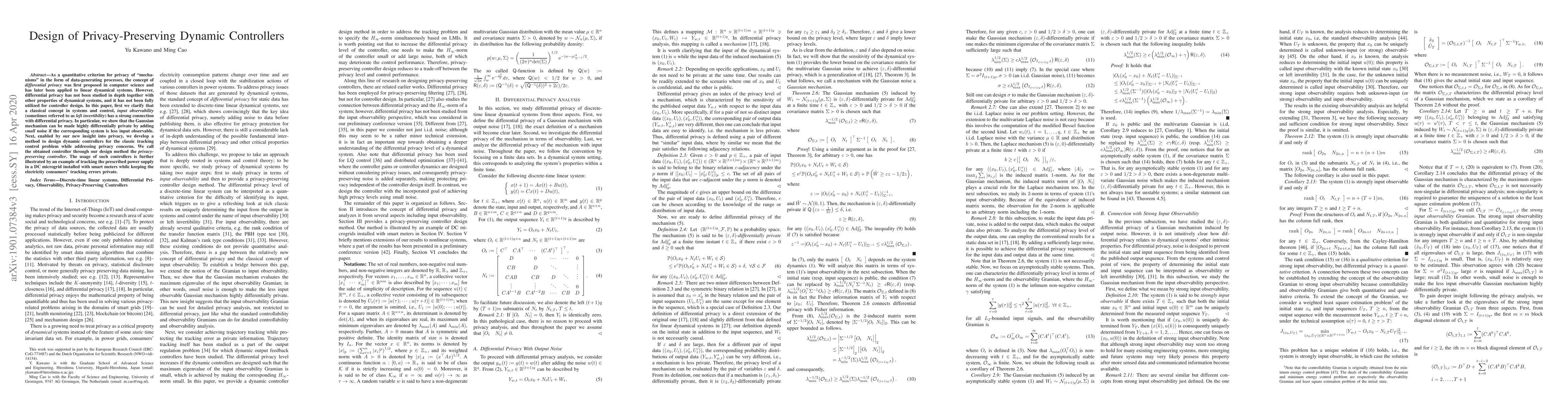 This paper explores the integration of differential privacy into the design of dynamic controllers, demonstrating a link between input observability and differential privacy. It proposes a method to develop privacy-preserving controllers for tracking control problems, illustrated by an example of maintaining privacy in a DC microgrid's power supply tracking.