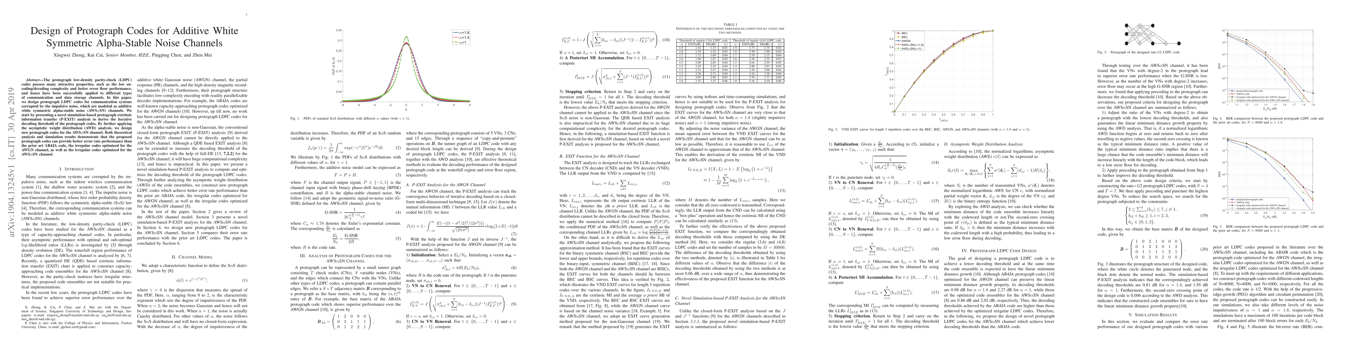 This paper designs protograph LDPC codes for communication systems affected by impulsive noise modeled as additive white symmetric alpha-stable noise (AWSaSN) channels. It employs a novel simulation-based P-EXIT analysis and AWD to optimize code performance, showing superior error rate results compared to existing codes.