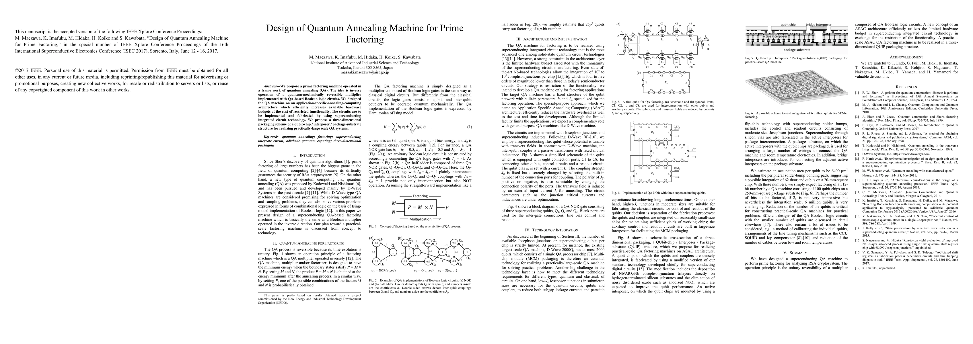 This paper proposes a quantum annealing machine for prime factoring, utilizing quantum annealing-based Boolean logic circuits. The design employs a specialized architecture and superconducting technology for efficient large-scale implementation, with a three-dimensional packaging scheme for practical realization.