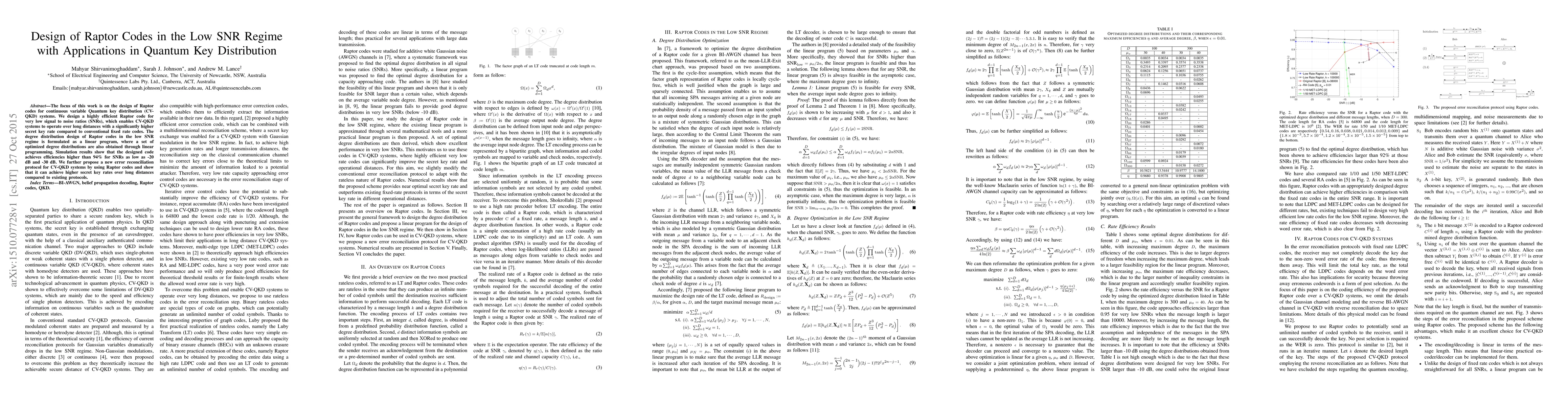 This paper designs highly efficient Raptor codes for continuous variable Quantum Key Distribution (CV-QKD) systems, optimizing their degree distribution through linear programming for operation at very low signal to noise ratios (SNRs). The proposed code achieves efficiencies above 94% at SNRs as low as -20 dB and -30 dB, significantly enhancing secret key rates over long distances compared to conventional methods.