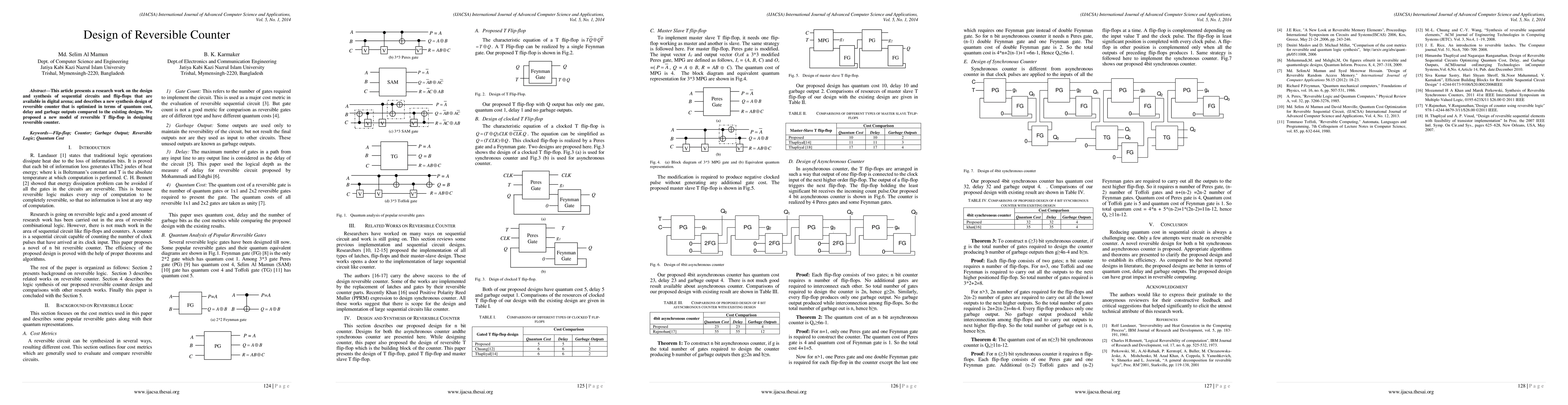 This article presents a research work on the design and synthesis of sequential circuits and flip-flops that are available in digital arena; and describes a new synthesis design of reversible counter that is optimized in terms of quantum cost, delay and garbage outputs compared to the existing designs. We proposed a new model of reversible T flip-flop in designing reversible counter