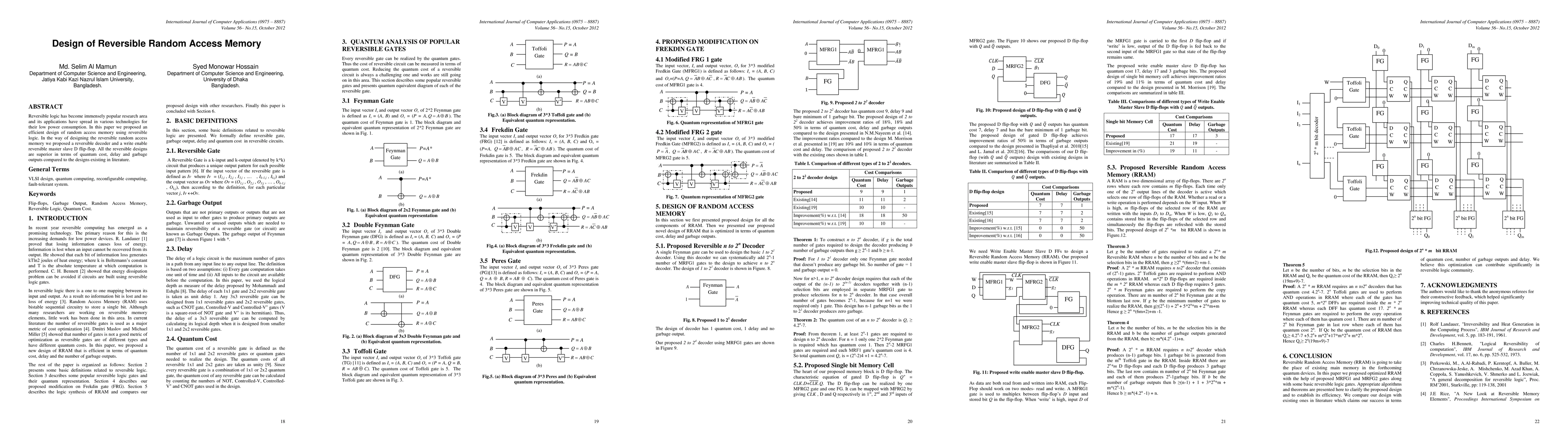 This paper proposes an efficient reversible random access memory design using reversible logic, featuring a reversible decoder and a write enable reversible master-slave D flip-flop, which outperforms existing designs in terms of quantum cost, delay, and garbage outputs.
