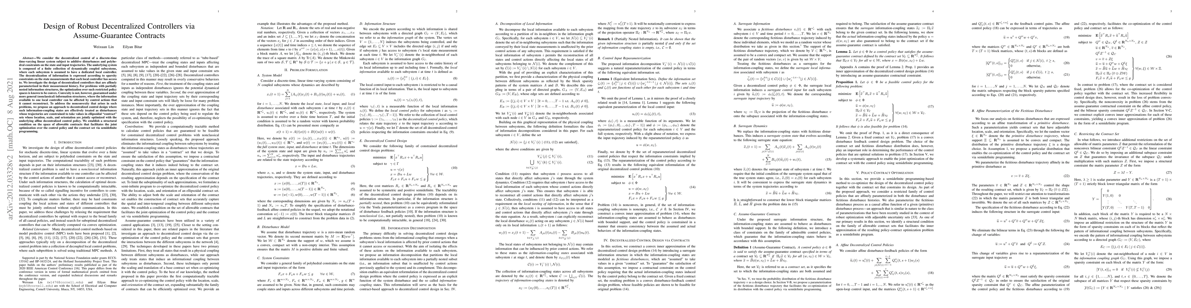 We consider the decentralized control of a discrete-time time-varying linear system subject to additive disturbances and polyhedral constraints on the state and input trajectories. The underlying system is composed of a finite collection of dynamically coupled subsystems, where each subsystem is assumed to have a dedicated local controller. The decentralization of information is expressed according to sparsity constraints on the state measurements that each local controller has access to. We investigate the design of decentralized controllers that are affinely parameterized in their measurement history. For problems with partially nested information structures, the optimization over such restricted policy spaces is known to be convex. Convexity is not, however, guaranteed under more general (nonclassical) information structures, where the information available to one local controller can be affected by control actions that it cannot reconstruct. To address the nonconvexity that arises in such problems, we propose an approach to decentralized control design where such information-coupling states are effectively treated as disturbances whose trajectories are constrained to take values in ellipsoidal "contract" sets whose location, scale, and orientation are jointly optimized with the underlying affine decentralized control policy. We establish a structural condition on the space of allowable contracts that facilitates the joint optimization over the control policy and the contract set via semidefinite programming.