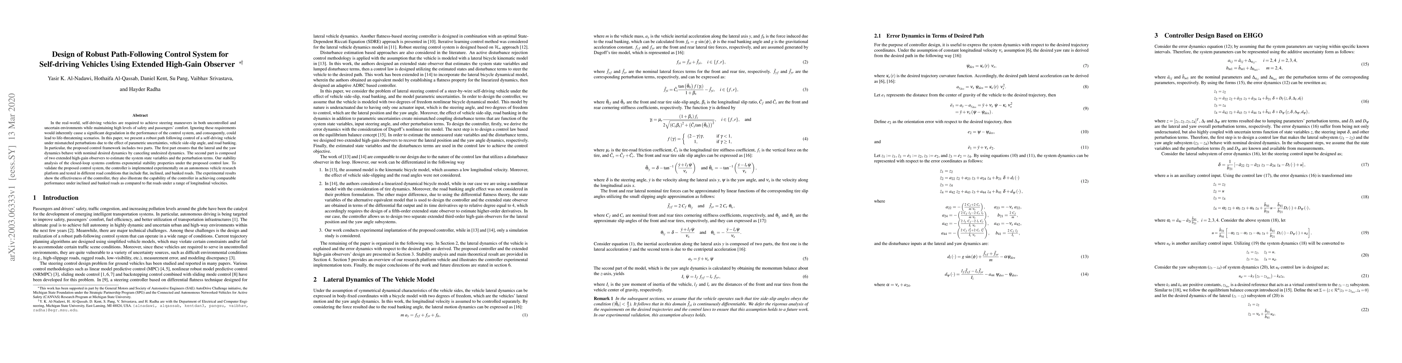 In the real-world, self-driving vehicles are required to achieve steering maneuvers in both uncontrolled and uncertain environments while maintaining high levels of safety and passengers' comfort. Ignoring these requirements would inherently cause a significant degradation in the performance of the control system, and consequently, could lead to life-threatening scenarios. In this paper, we present a robust path following control of a self-driving vehicle under mismatched perturbations due to the effect of parametric uncertainties, vehicle side-slip angle, and road banking. In particular, the proposed control framework includes two parts. The first part ensures that the lateral and the yaw dynamics behave with nominal desired dynamics by canceling undesired dynamics. The second part is composed of two extended high-gain observers to estimate the system state variables and the perturbation terms. Our stability analysis of the closed-loop systems confirms exponential stability properties under the proposed control law. To validate the proposed control system, the controller is implemented experimentally on an autonomous vehicle research platform and tested in different road conditions that include flat, inclined, and banked roads. The experimental results show the effectiveness of the controller, they also illustrate the capability of the controller in achieving comparable performance under inclined and banked roads as compared to flat roads under a range of longitudinal velocities.