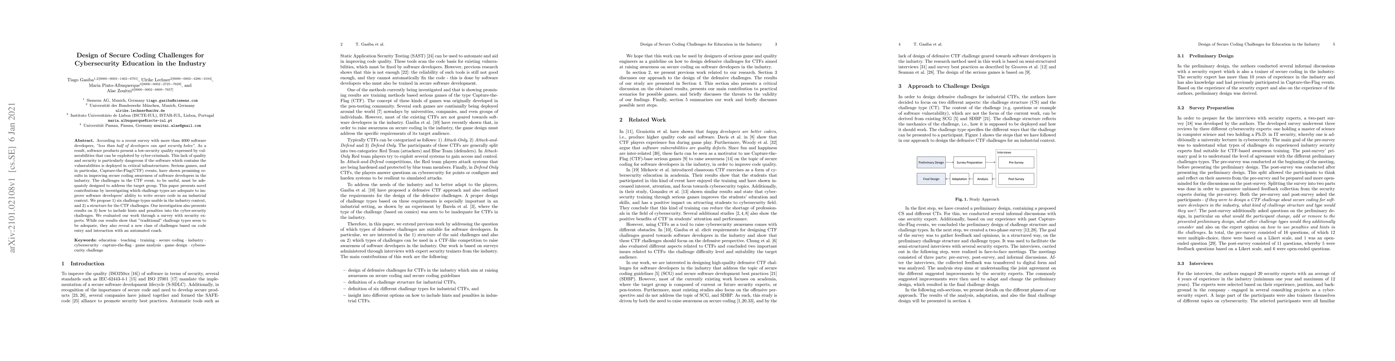 According to a recent survey with more than 4000 software developers, less than half of developers can spot security holes. As a result, software products present a low-security quality expressed by vulnerabilities that can be exploited by cyber-criminals. This lack of quality and security is particularly dangerous if the software which contains the vulnerabilities is deployed in critical infrastructures. Serious games, and in particular, Capture-the-Flag(CTF) events, have shown promising results in improving secure coding awareness of software developers in the industry. The challenges in the CTF event, to be useful, must be adequately designed to address the target group. This paper presents novel contributions by investigating which challenge types are adequate to improve software developers' ability to write secure code in an industrial context. We propose 1) six challenge types usable in the industry context, and 2) a structure for the CTF challenges. Our investigation also presents results on 3) how to include hints and penalties into the cyber-security challenges. We evaluated our work through a survey with security experts. While our results show that "traditional" challenge types seem to be adequate, they also reveal a new class of challenges based on code entry and interaction with an automated coach.
