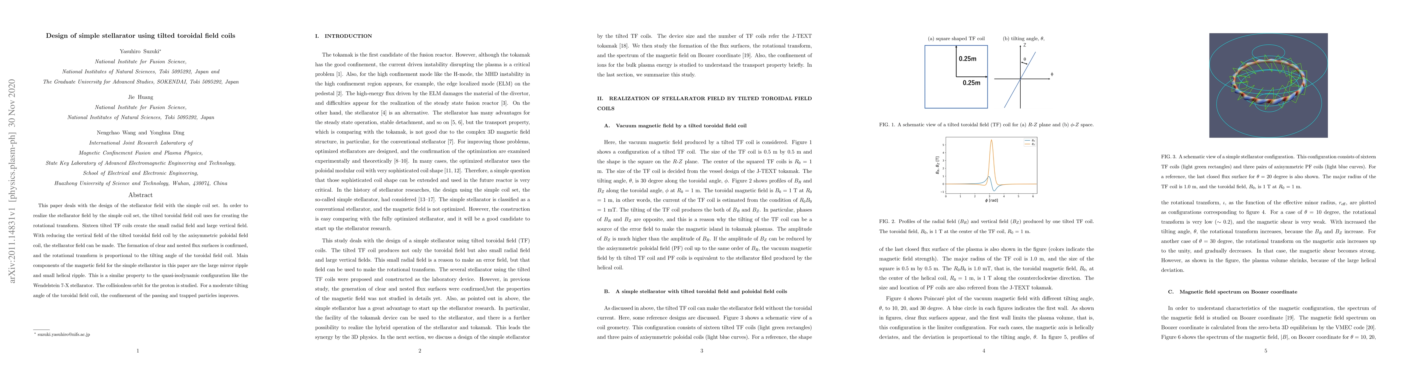 This paper designs a simple stellarator using tilted toroidal field coils to create rotational transform, achieving clear nested flux surfaces and improved particle confinement. The main magnetic field components are large mirror ripple and small helical ripple, similar to the Wendelstein 7-X stellarator.