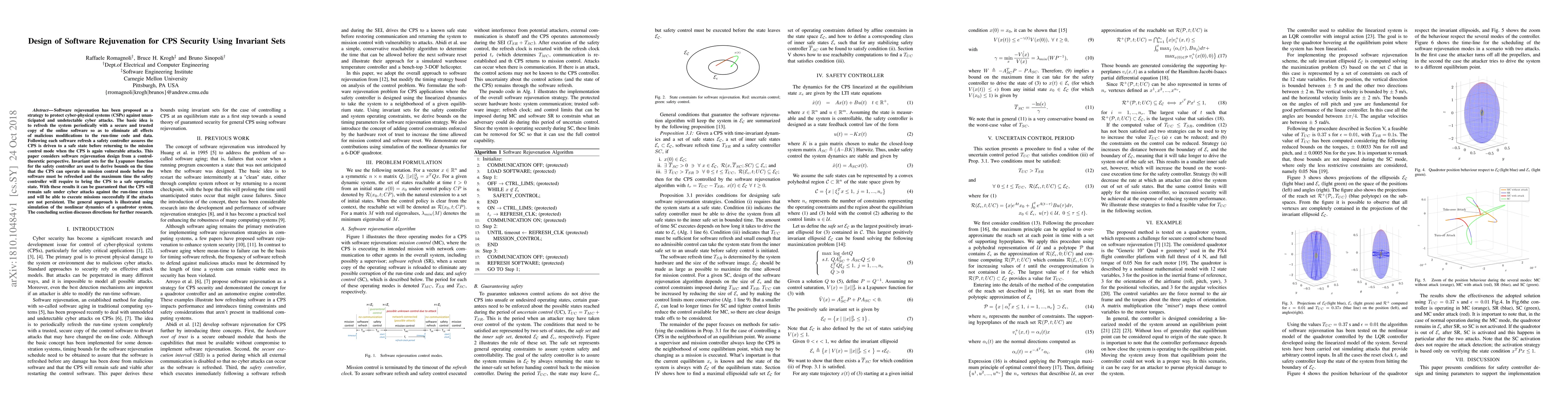 This paper proposes a control-theoretic approach to software rejuvenation for CPS security, using invariant sets to determine optimal rejuvenation intervals and safety controller recovery times. Simulation results on a quadrotor system demonstrate the effectiveness of the method in maintaining CPS safety against cyber attacks.