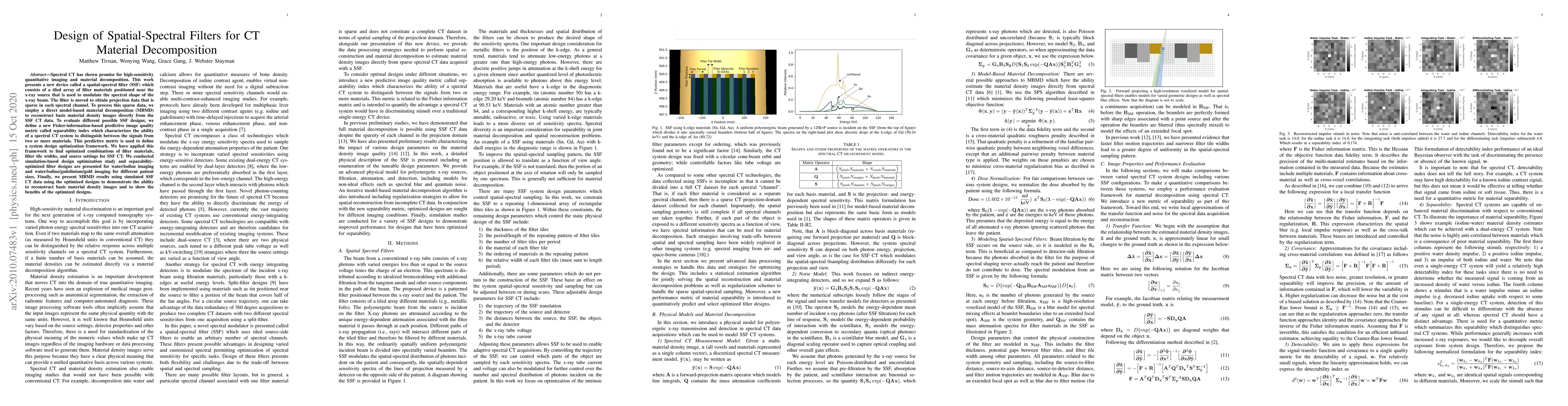 The research presents a new device called a spatial-spectral filter (SSF) for spectral CT, which modulates the spectral shape of the x-ray beam. It employs a direct model-based material decomposition (MBMD) to reconstruct basis material density images directly from the SSF CT data. The design optimization framework uses a Fisher-information-based predictive image quality metric called separability index.
