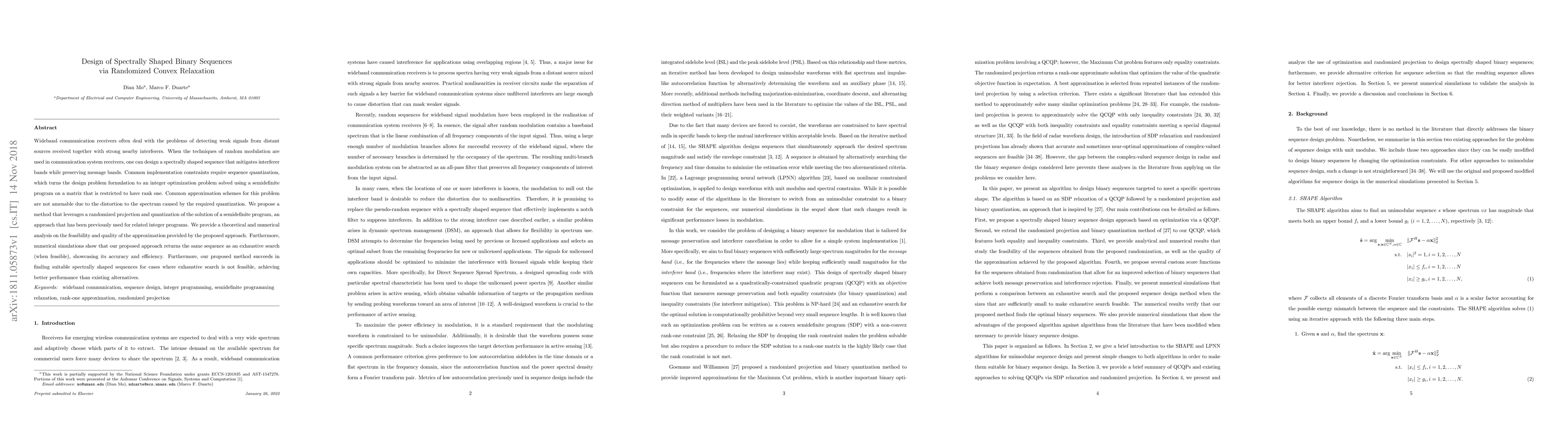 This paper proposes a randomized convex relaxation method for designing spectrally shaped binary sequences to mitigate interference in wideband communication receivers. The method leverages randomized projection and quantization of semidefinite program solutions, outperforming existing alternatives in both accuracy and efficiency.