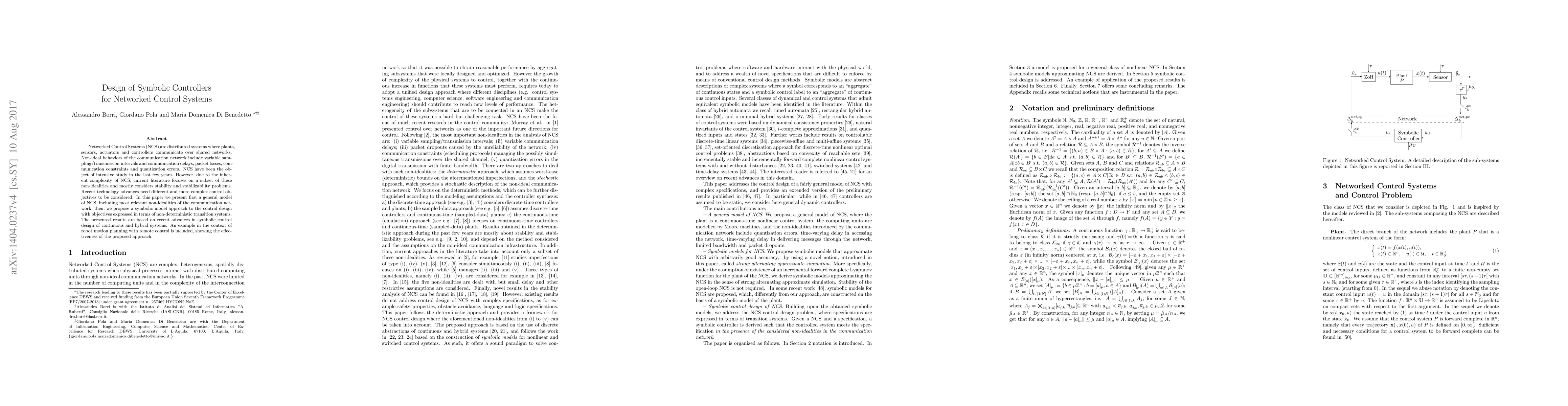 Networked Control Systems (NCS) are distributed systems where plants, sensors, actuators and controllers communicate over shared networks. Non-ideal behaviors of the communication network include variable sampling/transmission intervals and communication delays, packet losses, communication constraints and quantization errors. NCS have been the object of intensive study in the last few years. However, due to the inherent complexity of NCS, current literature focuses on a subset of these non-idealities and mostly considers stability and stabilizability problems. Recent technology advances need different and more complex control objectives to be considered. In this paper we present first a general model of NCS, including most relevant non-idealities of the communication network; then, we propose a symbolic model approach to the control design with objectives expressed in terms of non-deterministic transition systems. The presented results are based on recent advances in symbolic control design of continuous and hybrid systems. An example in the context of robot motion planning with remote control is included, showing the effectiveness of the proposed approach.