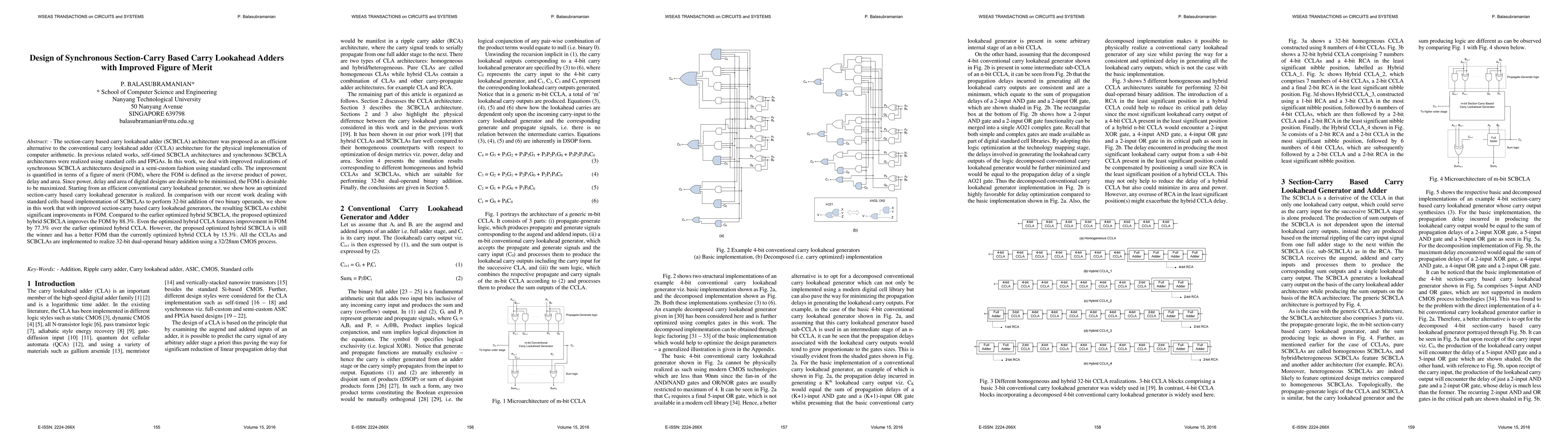 This paper presents improved synchronous section-carry based carry lookahead adders (SCBCLA) designed in a semi-custom fashion using standard cells, achieving significant enhancements in the figure of merit (FOM) compared to previous implementations. The optimized SCBCLAs outperform the optimized hybrid carry lookahead adders (CCLA) in terms of power, delay, and area efficiency.