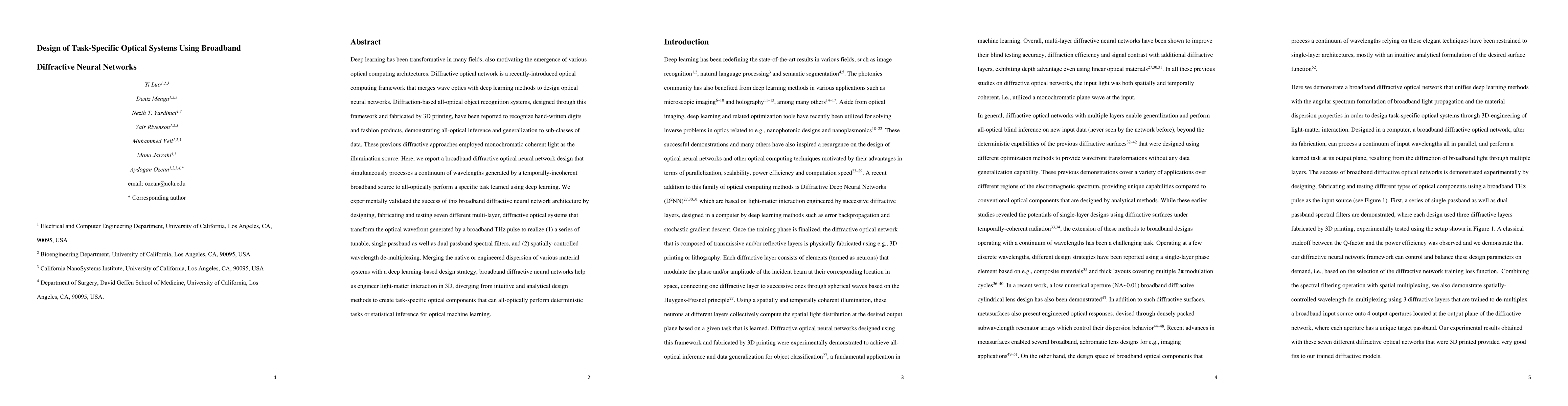 This paper presents a novel broadband diffractive optical neural network that processes a range of wavelengths to perform specific optical tasks learned via deep learning. Experimental validation demonstrates the design's effectiveness in creating tunable spectral filters and wavelength de-multiplexing, showcasing a shift from traditional design methods to a deep learning-based approach for engineering light-matter interactions.