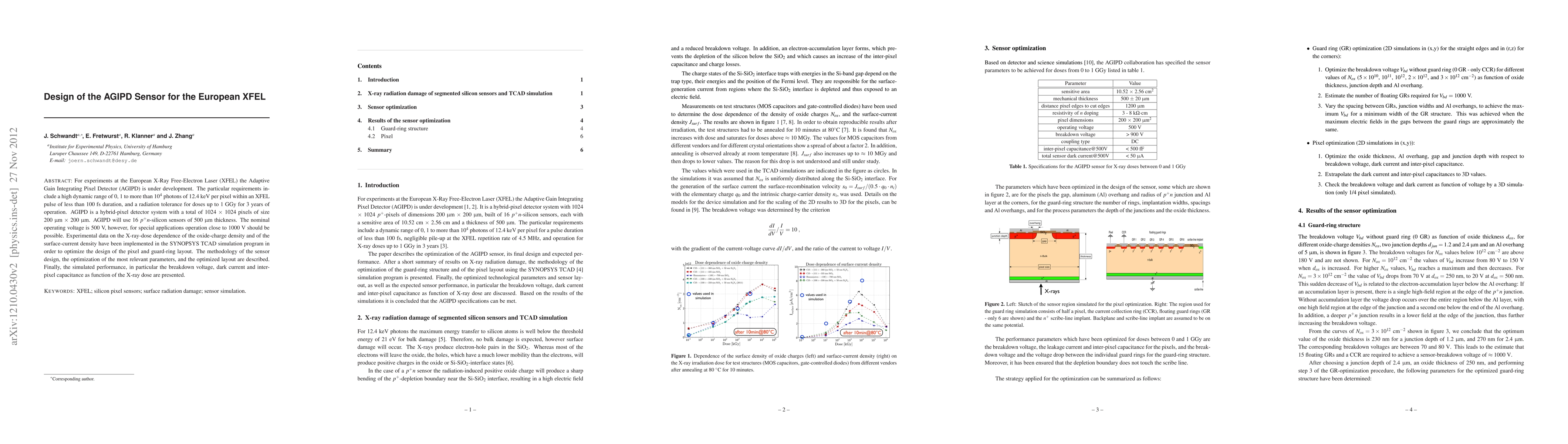 The AGIPD sensor for the European XFEL is designed to meet stringent requirements for high dynamic range and radiation tolerance, featuring 1024 x 1024 pixels with a 200 um size on 500 um thick n-type silicon. Simulation and optimization of pixel and guard-ring layout were performed to ensure optimal performance under extreme conditions.