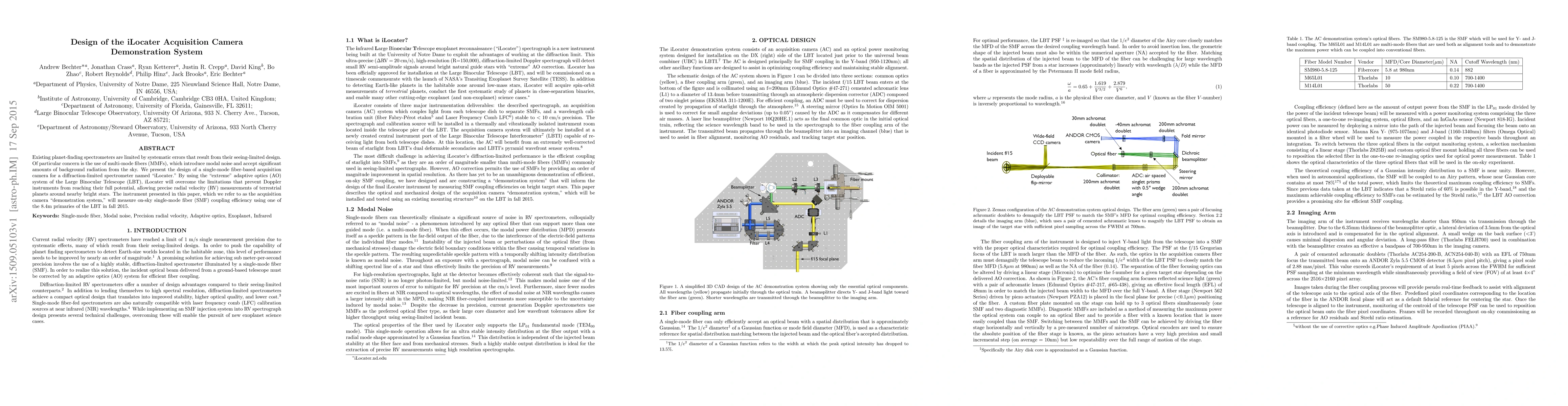 This paper presents the design of an acquisition camera demonstration system for the iLocater spectrometer, which aims to overcome systematic errors in existing planet-finding instruments using single-mode fibers and extreme adaptive optics on the Large Binocular Telescope to achieve precise radial velocity measurements of terrestrial planets. The demonstration system will test single-mode fiber coupling efficiency on-sky in fall 2015.