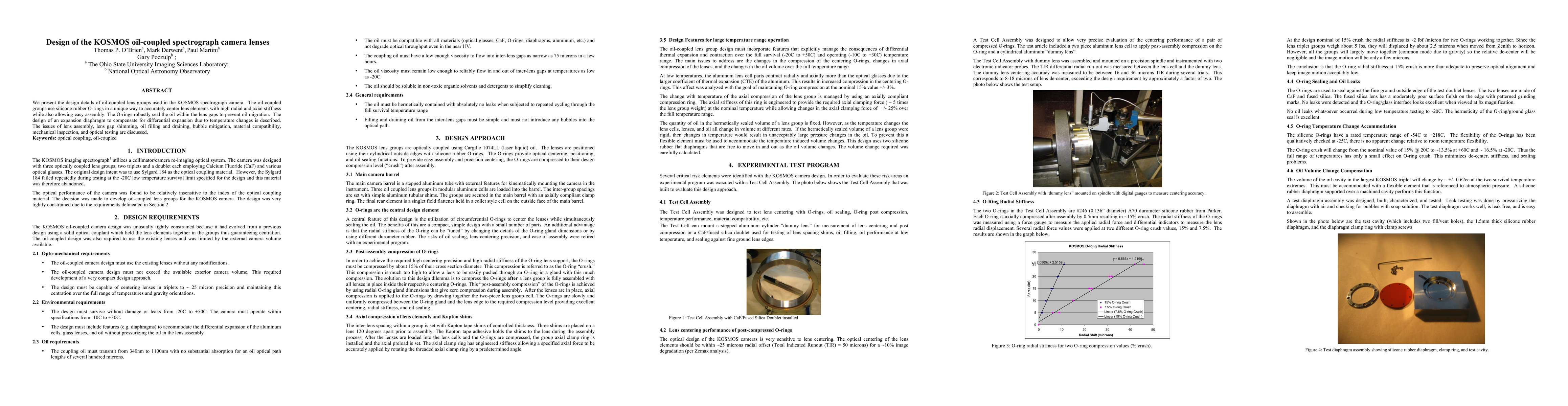 We present the design details of oil-coupled lens groups used in the KOSMOS spectrograph camera. The oil-coupled groups use silicone rubber O-rings in a unique way to accurately center lens elements with high radial and axial stiffness while also allowing easy assembly. The O-rings robustly seal the oil within the lens gaps to prevent oil migration. The design of an expansion diaphragm to compensate for differential expansion due to temperature changes is described. The issues of lens assembly, lens gap shimming, oil filling and draining, bubble mitigation, material compatibility, mechanical inspection, and optical testing are discussed.