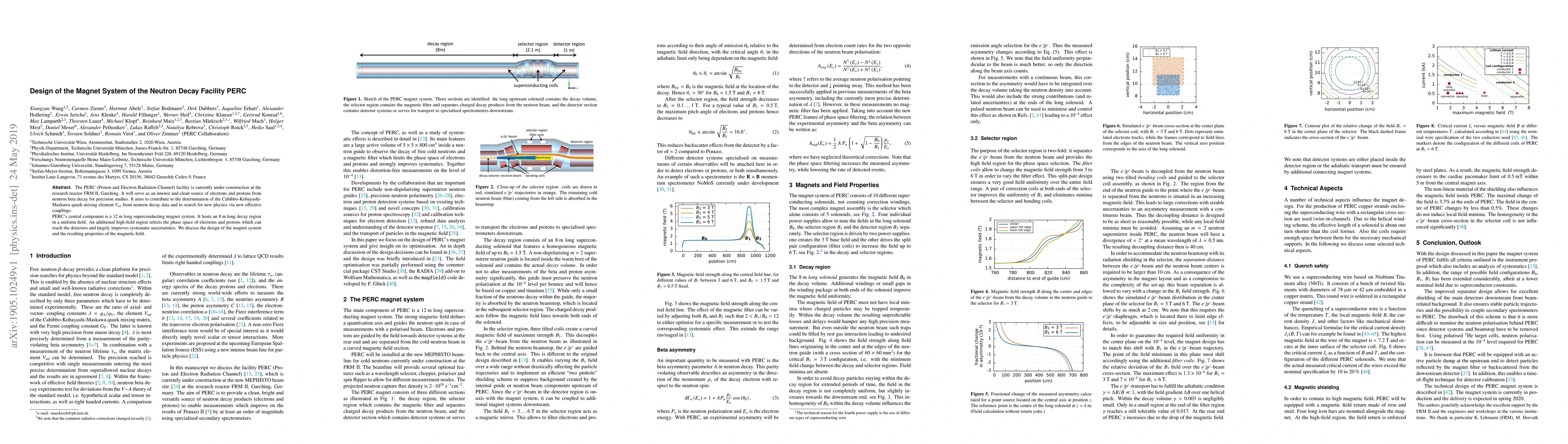 The PERC (Proton and Electron Radiation Channel) facility is currently under construction at the research reactor FRM II, Garching. It will serve as an intense and clean source of electrons and protons from neutron beta decay for precision studies. It aims to contribute to the determination of the Cabibbo-Kobayashi-Maskawa quark-mixing element $V_{ud}$ from neutron decay data and to search for new physics via new effective couplings. PERC's central component is a 12m long superconducting magnet system. It hosts an 8m long decay region in a uniform field. An additional high-field region selects the phase space of electrons and protons which can reach the detectors and largely improves systematic uncertainties. We discuss the design of the magnet system and the resulting properties of the magnetic field.