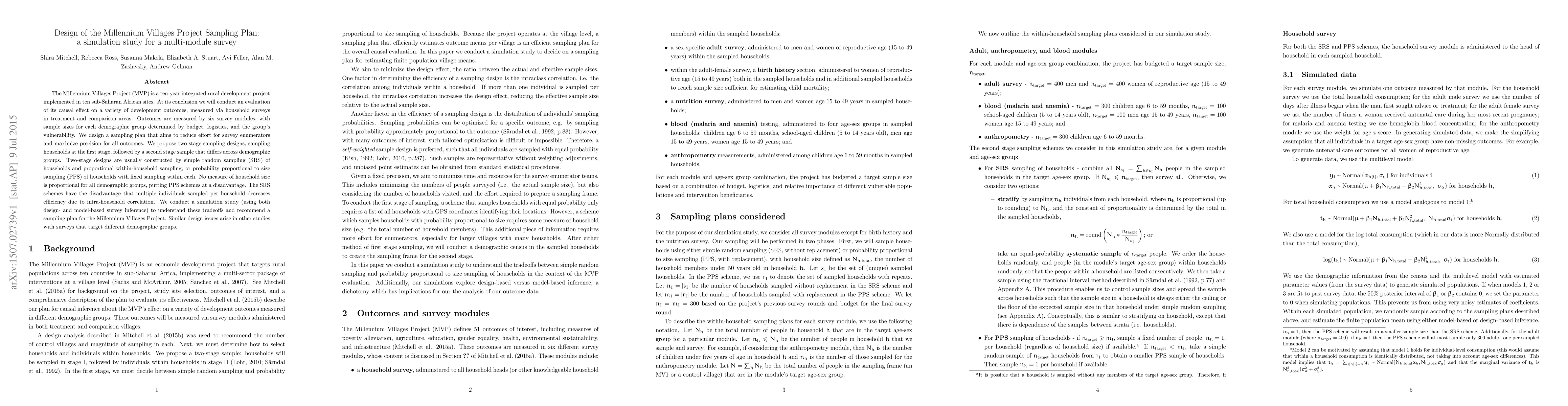 The Millennium Villages Project aims to evaluate its impact through a multi-module survey; a simulation study proposes a two-stage sampling plan to optimize precision and reduce survey effort, balancing the trade-offs between simple random sampling and probability proportional to size sampling. The study recommends a tailored sampling approach for different demographic groups.