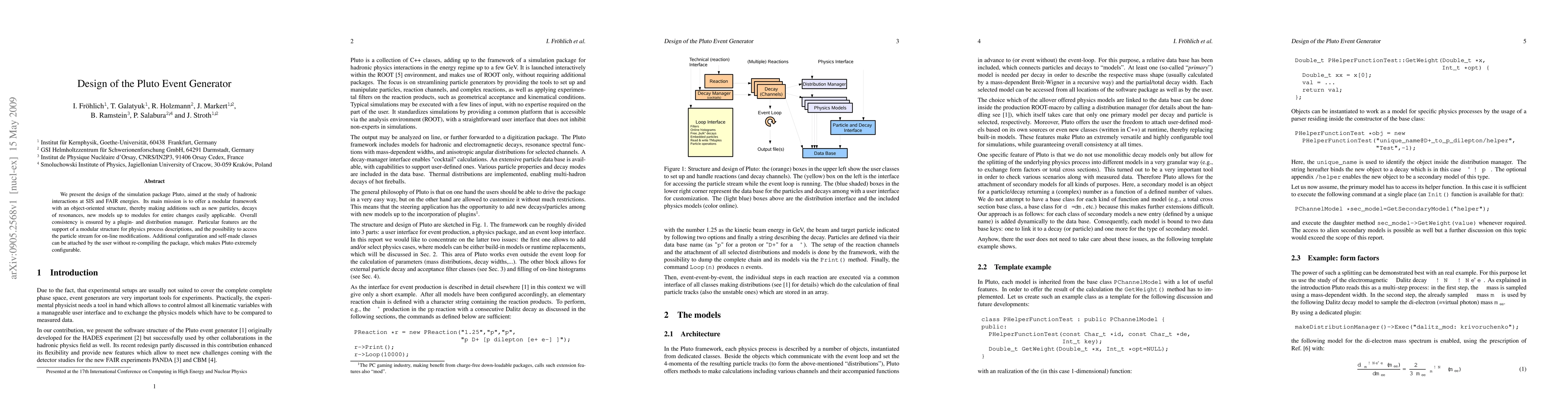 We present the design of the simulation package Pluto, aimed at the study of hadronic interactions at SIS and FAIR energies. Its main mission is to offer a modular framework with an object-oriented structure, thereby making additions such as new particles, decays of resonances, new models up to modules for entire changes easily applicable. Overall consistency is ensured by a plugin- and distribution manager. Particular features are the support of a modular structure for physics process descriptions, and the possibility to access the particle stream for on-line modifications. Additional configuration and self-made classes can be attached by the user without re-compiling the package, which makes Pluto extremely configurable.