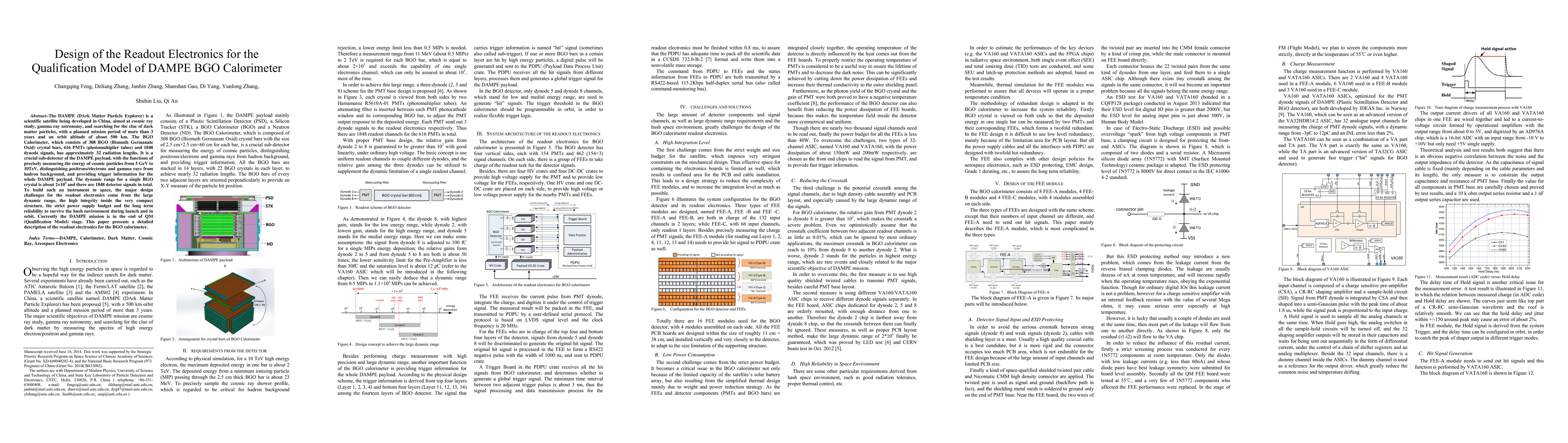 This paper details the design of the readout electronics for the BGO calorimeter in the DAMPE satellite, focusing on addressing challenges such as large dynamic range, compact structure integrity, strict power supply constraints, and long-term reliability for space missions. The BGO calorimeter, crucial for measuring cosmic particle energies and distinguishing particle types, comprises 308 BGO crystals, 616 PMTs, and 1848 dynode signals.