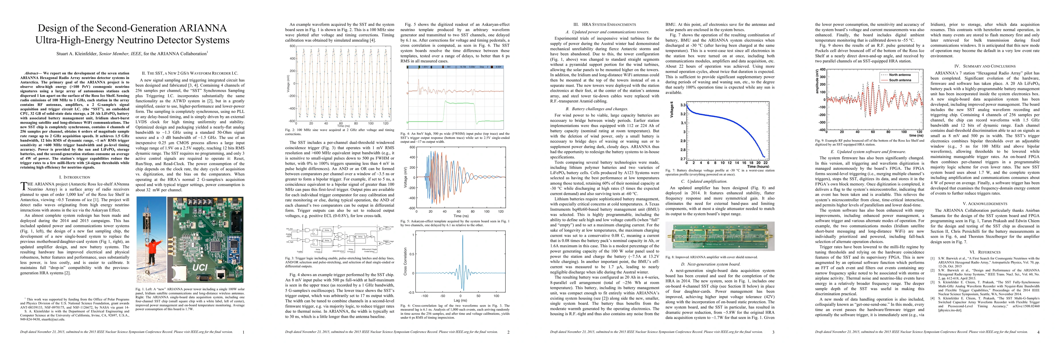 The paper details the design of the second-generation ARIANNA Hexagonal Radio Array, a seven-station neutrino detector in Antarctica, aimed at detecting ultra-high energy neutrinos. The stations feature advanced RF antennas, signal acquisition circuits, and autonomous power management, with the new SST chip enhancing sensitivity and timing accuracy.