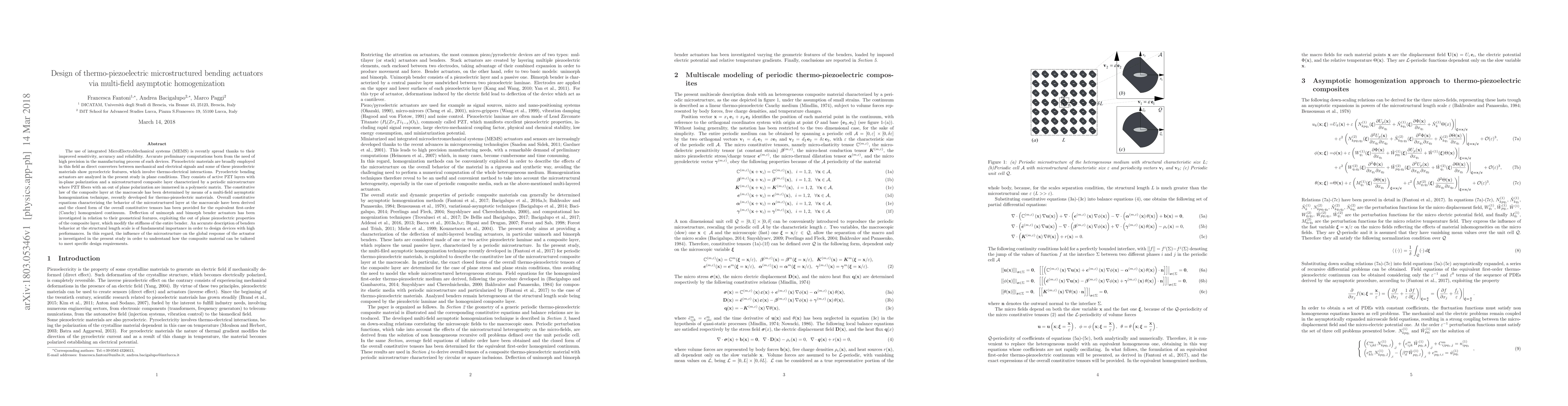 This paper investigates the design of thermo-piezoelectric microstructured bending actuators using multi-field asymptotic homogenization. It derives constitutive equations for a composite layer with PZT fibers and a polymeric matrix, determining its macroscale behavior and exploring its influence on actuator deflection and design.