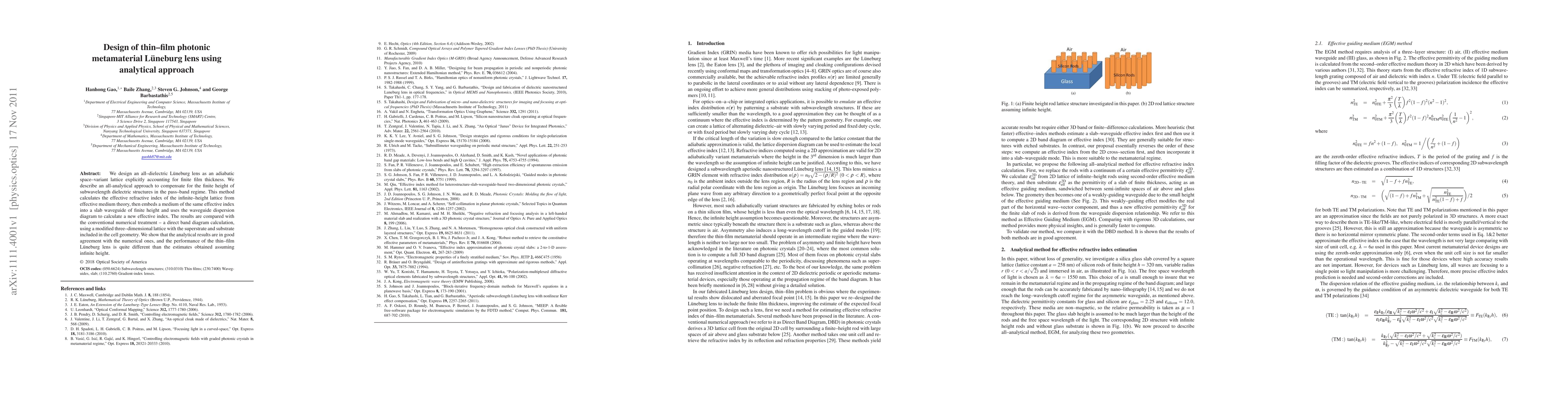 We design an all-dielectric L\"uneburg lens as an adiabatic space-variant lattice explicitly accounting for finite film thickness. We describe an all-analytical approach to compensate for the finite height of subwavelength dielectric structures in the pass-band regime. This method calculates the effective refractive index of the infinite-height lattice from effective medium theory, then embeds a medium of the same effective index into a slab waveguide of finite height and uses the waveguide dispersion diagram to calculate a new effective index. The results are compared with the conventional numerical treatment - a direct band diagram calculation, using a modified three-dimensional lattice with the superstrate and substrate included in the cell geometry. We show that the analytical results are in good agreement with the numerical ones, and the performance of the thin-film L\"uneburg lens is quite different than the estimates obtained assuming infinite height.