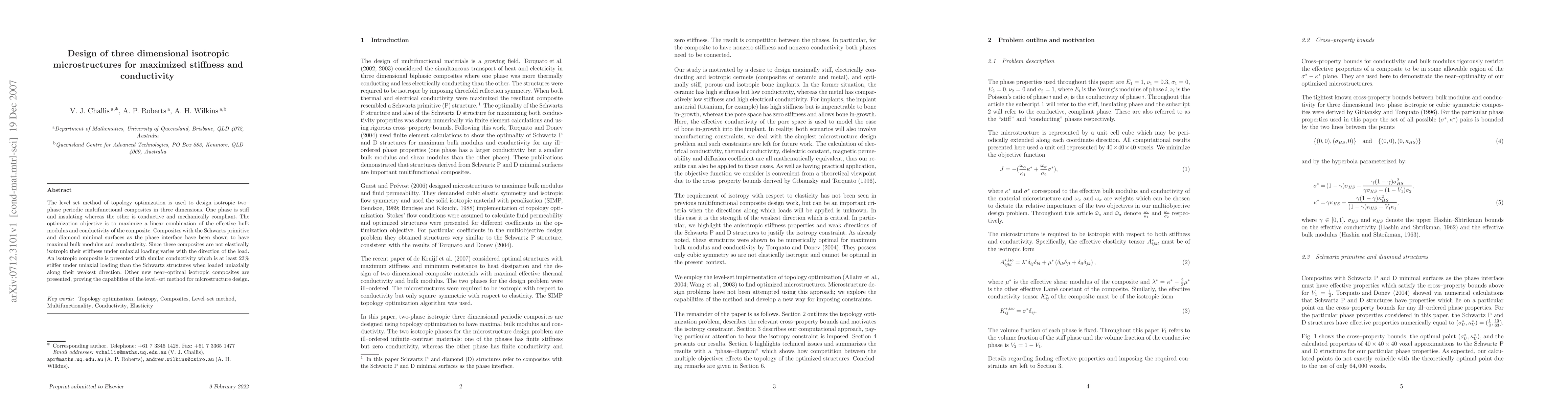 The paper utilizes the level-set method for topology optimization to design three-dimensional isotropic composites that maximize both stiffness and conductivity. An isotropic composite with diamond minimal surfaces is shown to be 23% stiffer than previous Schwartz structures when loaded along its weakest direction.