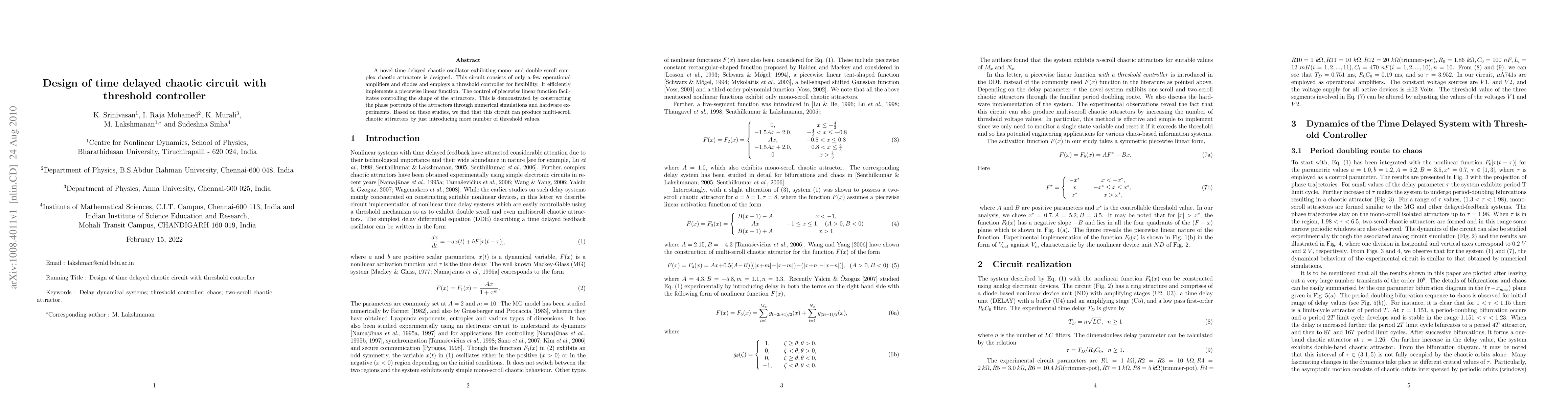 A novel time delayed chaotic circuit is designed to produce mono- and double scroll complex chaotic attractors with a threshold controller for flexibility. The circuit efficiently implements a piecewise linear function, enabling control over the shape of the attractors.