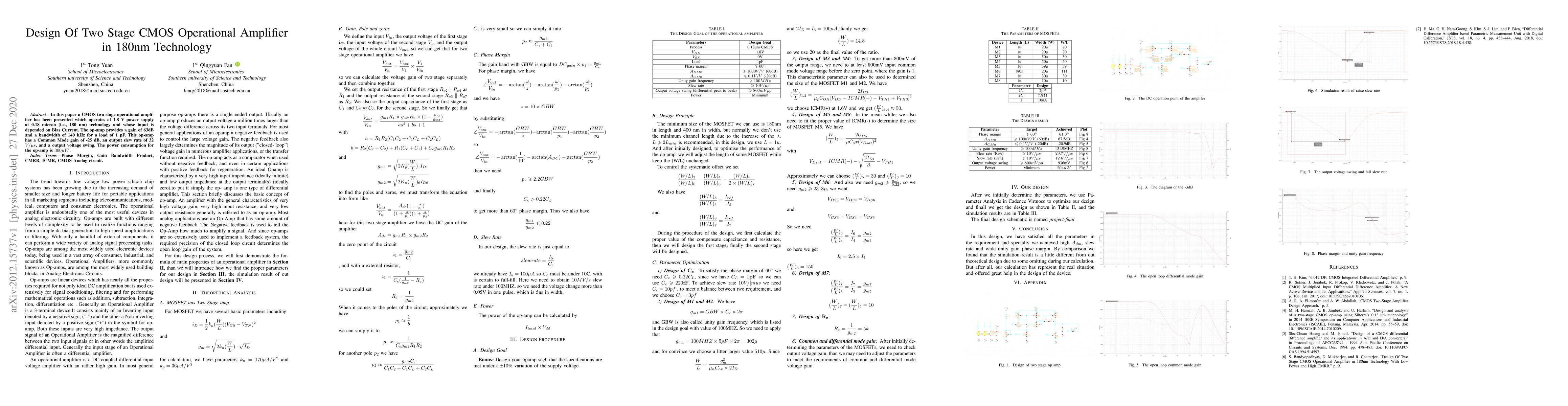 This paper designs a 2-stage CMOS operational amplifier with a gain of 63dB and a power consumption of $300μ W$ in 180nm technology.