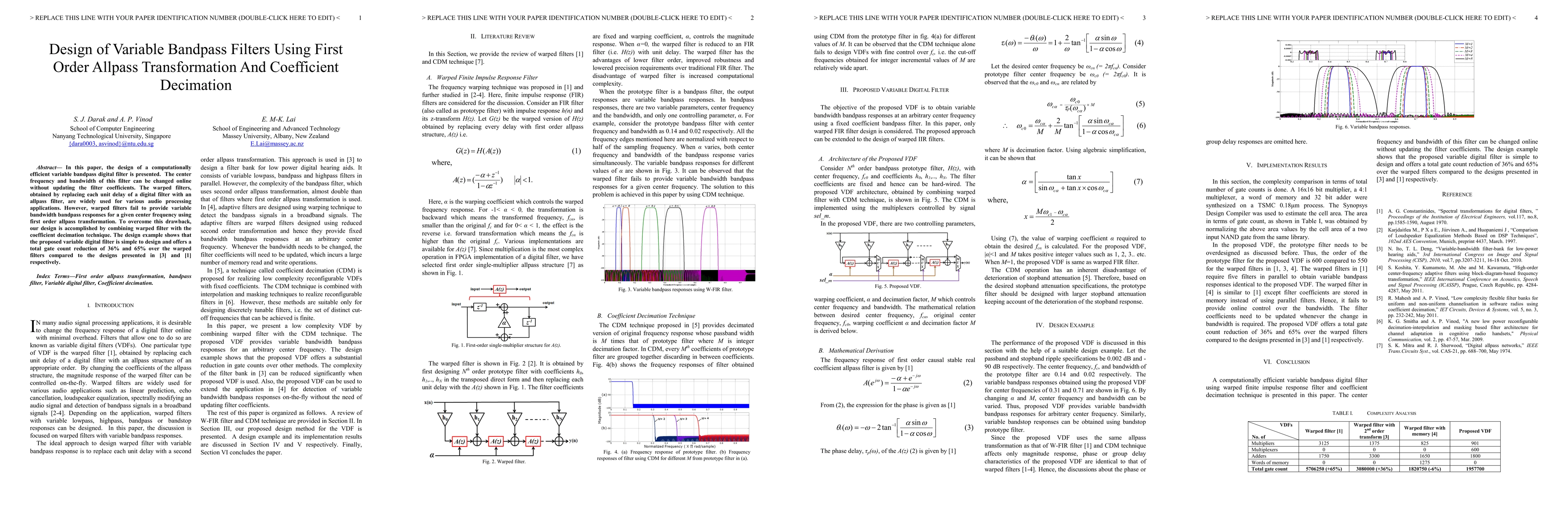 A novel design for variable bandpass digital filters is presented, offering improved efficiency and flexibility compared to existing warped filter methods.