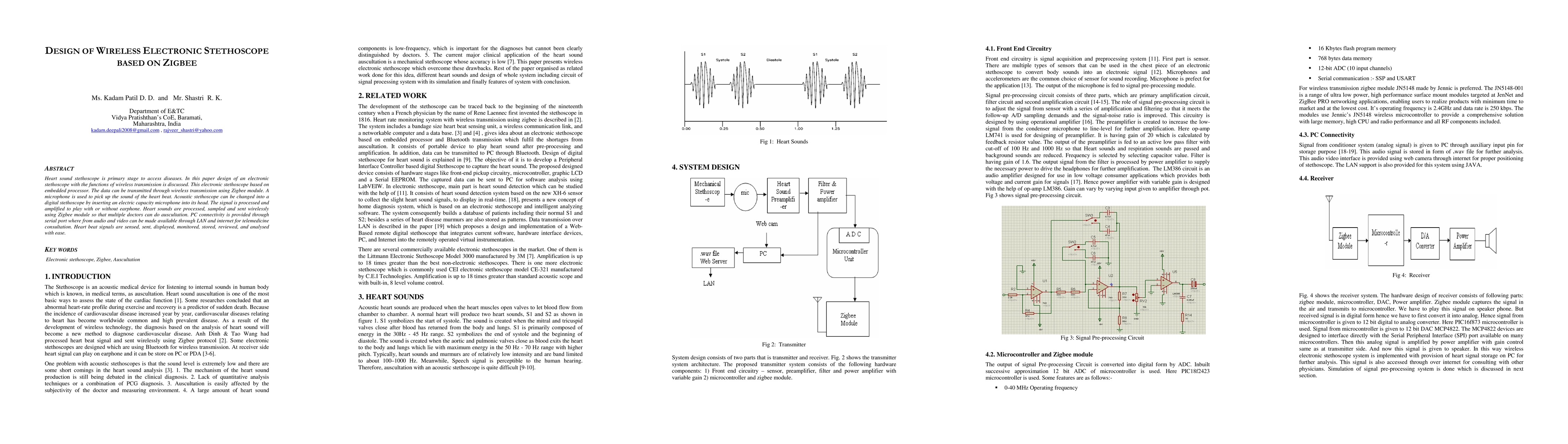 This paper details the design of a wireless electronic stethoscope utilizing a Zigbee module for data transmission. The stethoscope converts acoustic heart sounds into digital signals, enabling remote auscultation and telemedicine consultations via PC connectivity.