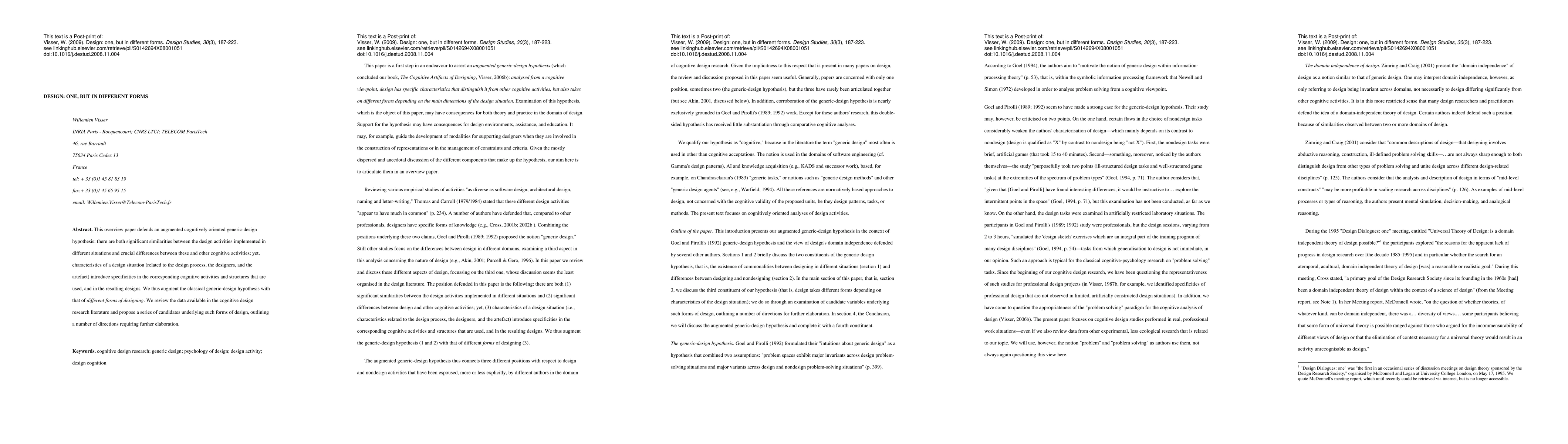 This paper proposes an augmented generic-design hypothesis, suggesting there are both similar and distinct design activities across different situations, shaped by specific design contexts. It outlines several underlying forms of designing that require further exploration.