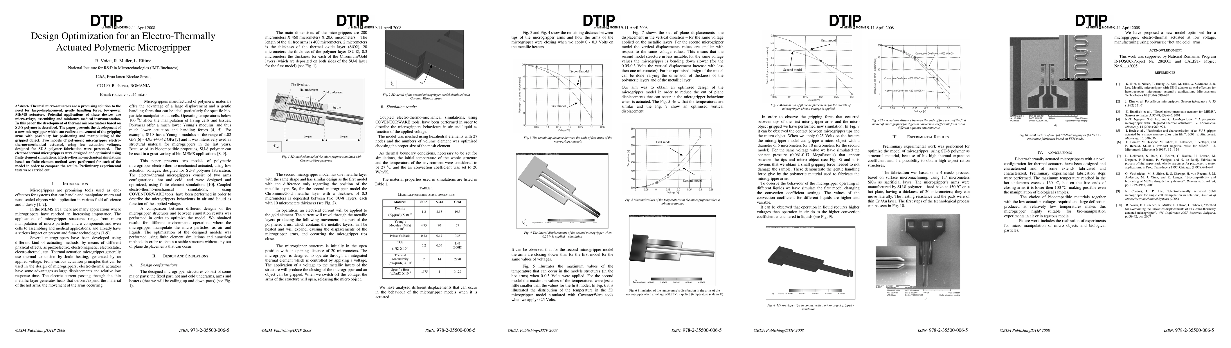 Thermal micro-actuators are a promising solution to the need for large-displacement, gentle handling force, low-power MEMS actuators. Potential applications of these devices are micro-relays, assembling and miniature medical instrumentation. In this paper the development of thermal microactuators based on SU-8 polymer is described. The paper presents the development of a new microgripper which can realize a movement of the gripping arms with possibility for positioning and manipulating of the gripped object. Two models of polymeric microgripper electrothermo- mechanical actuated, using low actuation voltages, designed for SU-8 polymer fabrication were presented. The electro-thermal microgrippers were designed and optimized using finite element simulations. Electro-thermo-mechanical simulations based on finite element method were performed for each of the model in order to compare the results. Preliminary experimental tests were carried out.