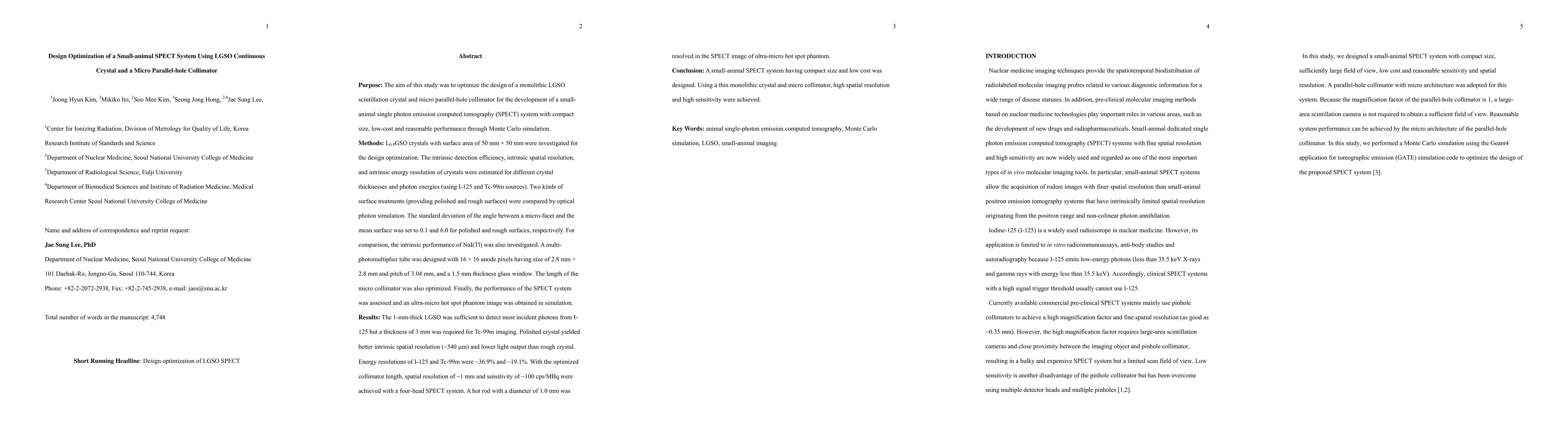 This study optimized the design of a small-animal SPECT system using LGSO crystals and a micro parallel-hole collimator, achieving compact size and reasonable performance. The 1-mm-thick LGSO crystal was sufficient for I-125 imaging, while 3 mm was needed for Tc-99m, with polished crystals showing better spatial resolution and lower light output.