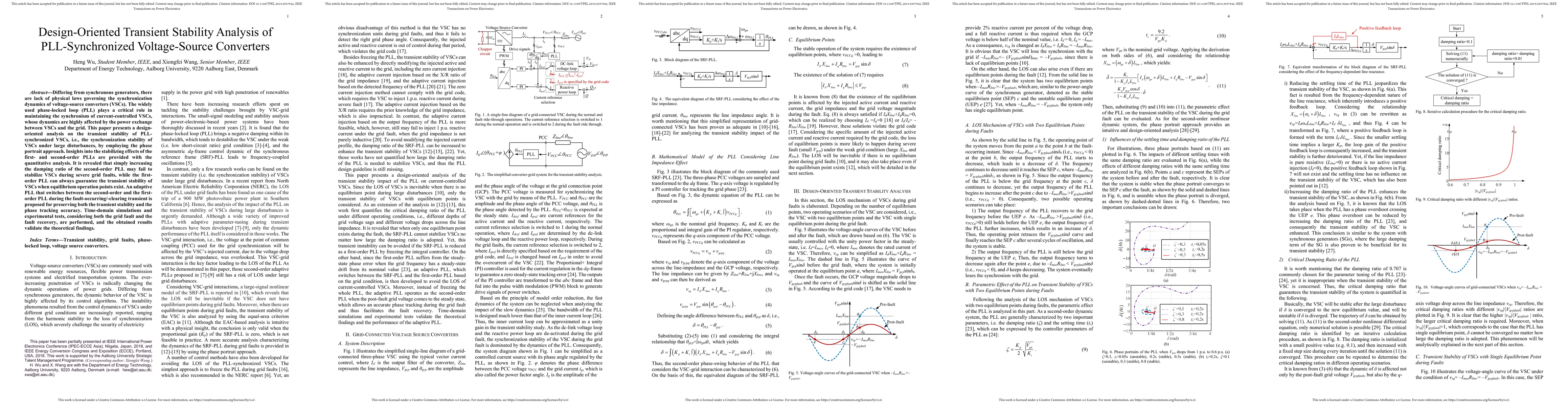 This paper presents a design-oriented transient stability analysis of PLL-synchronized voltage-source converters (VSCs) using phase portrait methods. It reveals that while the second-order PLL may not always stabilize VSCs during severe disturbances, the first-order PLL guarantees stability when equilibrium points exist. An adaptive PLL switching mechanism is proposed to maintain stability and phase accuracy during faults.