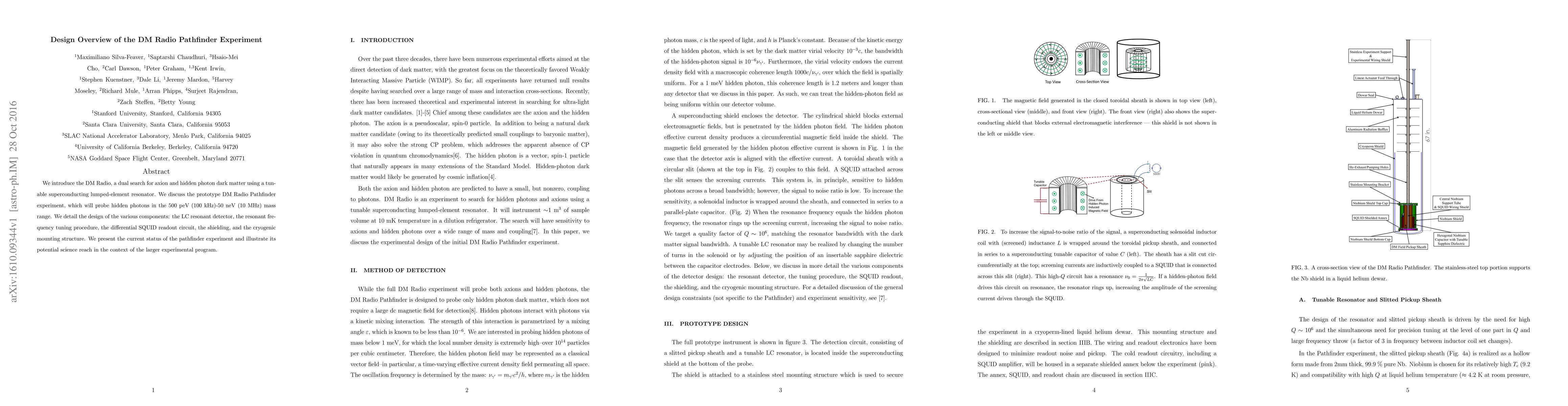 We introduce the DM Radio, a dual search for axion and hidden photon dark matter using a tunable superconducting lumped-element resonator. We discuss the prototype DM Radio Pathfinder experiment, which will probe hidden photons in the 500 peV (100 kHz)-50 neV (10 MHz) mass range. We detail the design of the various components: the LC resonant detector, the resonant frequency tuning procedure, the differential SQUID readout circuit, the shielding, and the cryogenic mounting structure. We present the current status of the pathfinder experiment and illustrate its potential science reach in the context of the larger experimental program.