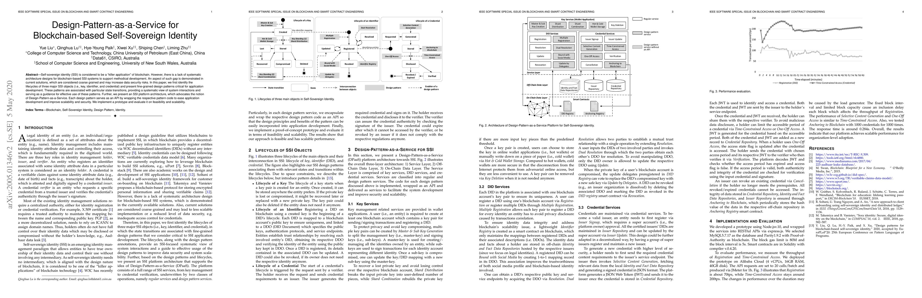 Self-sovereign identity (SSI) is considered to be a "killer application" of blockchain. However, there is a lack of systematic architecture designs for blockchain-based SSI systems to support methodical development. An aspect of such gap is demonstrated in current solutions, which are considered coarse grained and may increase data security risks. In this paper, we first identify the lifecycles of three major SSI objects (i.e., key, identifier, and credential) and present fine-grained design patterns critical for application development. These patterns are associated with particular state transitions, providing a systematic view of system interactions and serving as a guidance for effective use of these patterns. Further, we present an SSI platform architecture, which advocates the notion of Design-Pattern-as-a-Service. Each design pattern serves as an API by wrapping the respective pattern code to ease application development and improve scalability and security. We implement a prototype and evaluate it on feasibility and scalability.