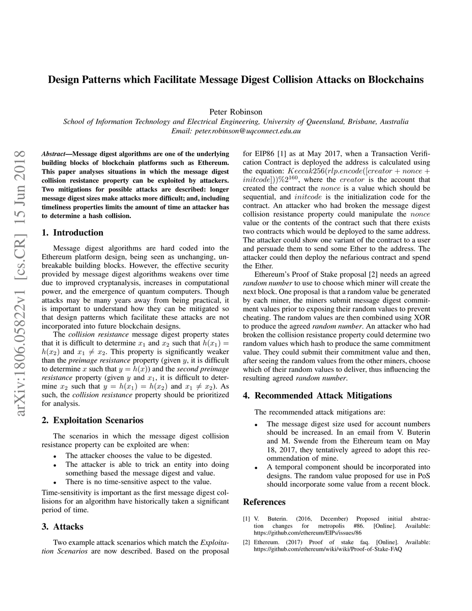 The paper analyzes situations where message digest collision resistance in blockchain platforms like Ethereum can be exploited by attackers.
