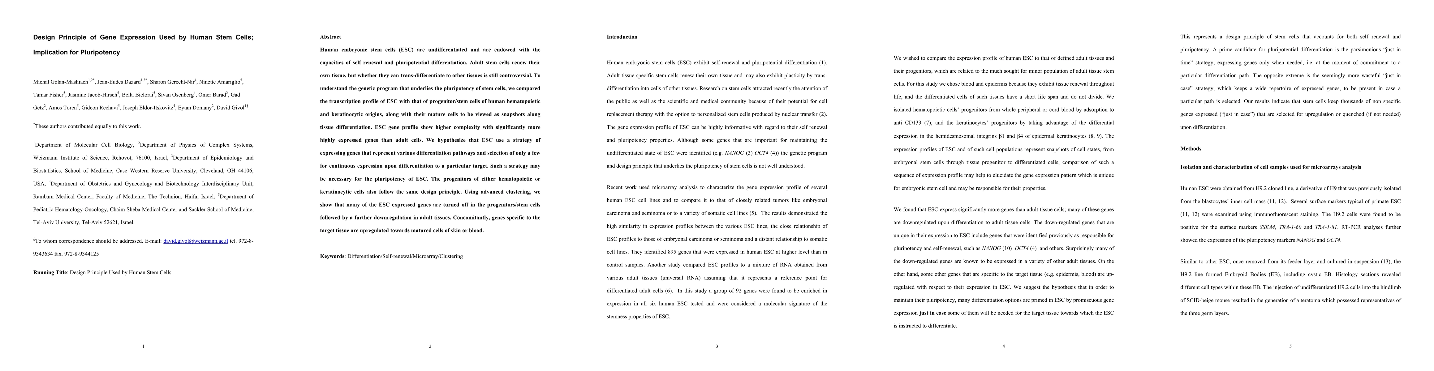 Human embryonic stem cells use a gene expression strategy to maintain pluripotency, involving the simultaneous expression of multiple differentiation pathways with selective downregulation in adult tissues. This design principle is also shared by progenitor/stem cells of various origins.
