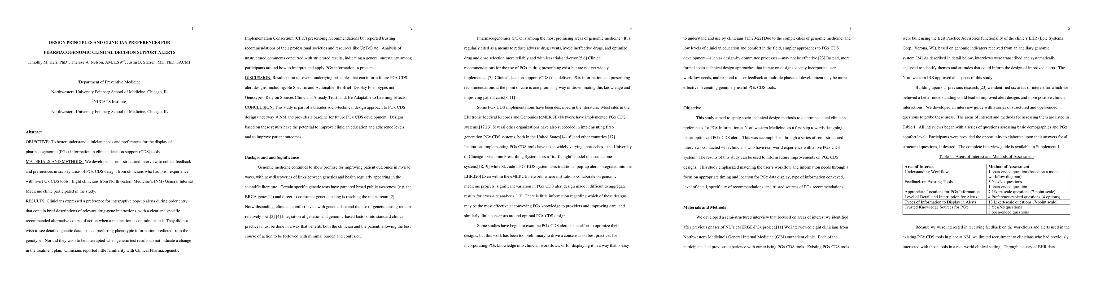 OBJECTIVE: To better understand clinician needs and preferences for the display of pharmacogenomic (PGx) information in clinical decision support (CDS) tools. MATERIALS AND METHODS: We developed a semi-structured interview to collect feedback and preferences in six key areas of PGx CDS design, from clinicians who had prior experience with live PGx CDS tools. Eight clinicians from Northwestern Medicine's (NM) General Internal Medicine clinic participated in the study. RESULTS: Clinicians expressed preference for interruptive pop-up alerts during order entry, brief descriptions of relevant drug-gene interactions, and a clear and specific recommended alternative course of action when a medication is contraindicated. They did not wish to see detailed genetic data, preferring phenotypic information predicted from the genotype. Nor did they wish to be interrupted when genetic test results do not indicate a change in treatment plan. Clinicians reported little familiarity with Clinical Pharmacogenetic Implementation Consortium prescribing recommendations but reported trusting recommendations of their professional societies and resources like UpToDate. Analysis of unstructured comments concurred with structured results, indicating a general uncertainty among participants around how to interpret and apply PGx information in practice. DISCUSSION: Results point to several underlying principles that can inform future PGx CDS alert designs: Be Specific and Actionable; Be Brief; Display Phenotypes not Genotypes; Rely on Sources Clinicians Already Trust; and, Be Adaptable to Learning Effects. CONCLUSION: This study is part of a broader socio-technical design approach to PGx CDS design underway at NM and provides a baseline for future PGx CDS development. Designs based on these results have the potential to improve clinician education and adherence levels, and to improve patient outcomes.
