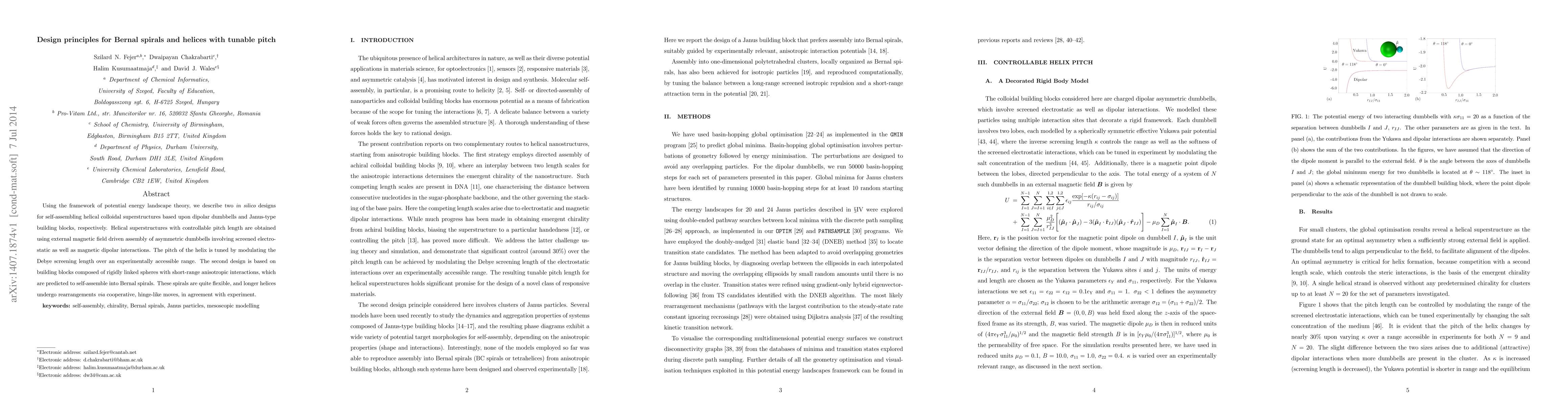 Using the framework of potential energy landscape theory, we describe two in silico designs for self-assembling helical colloidal superstructures based upon dipolar dumbbells and Janus-type building blocks, respectively. Helical superstructures with controllable pitch length are obtained using external magnetic field driven assembly of asymmetric dumbbells involving screened electrostatic as well as magnetic dipolar interactions. The pitch of the helix is tuned by modulating the Debye screening length over an experimentally accessible range. The second design is based on building blocks composed of rigidly linked spheres with short-range anisotropic interactions, which are predicted to self-assemble into Bernal spirals. These spirals are quite flexible, and longer helices undergo rearrangements via cooperative, hinge-like moves, in agreement with experiment.